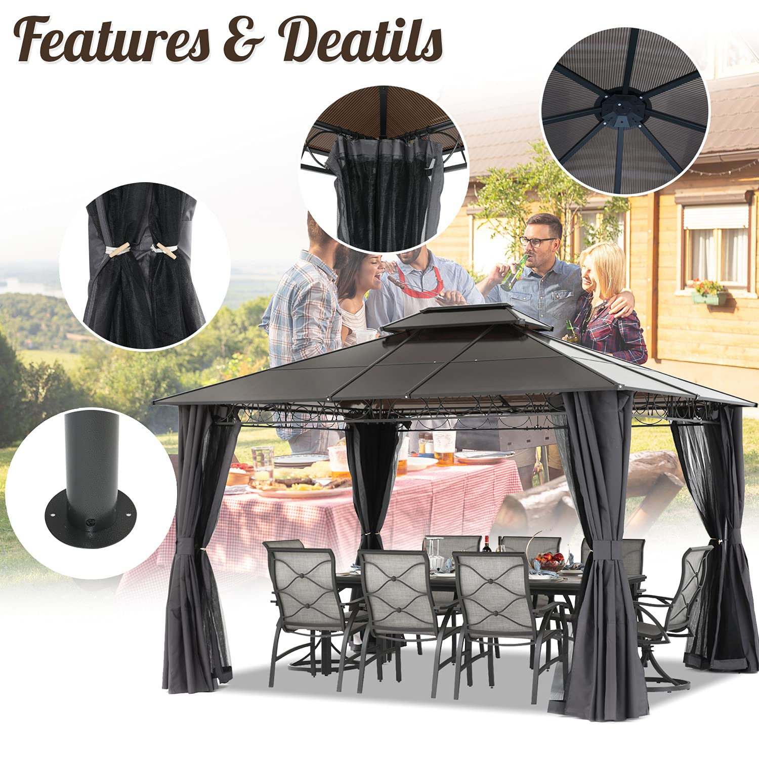 【Gazebo】10x12 Double Roof Hardtop Patio Gazebo Canopy Aluminum Frame with Netting & Screen Walls Curtains