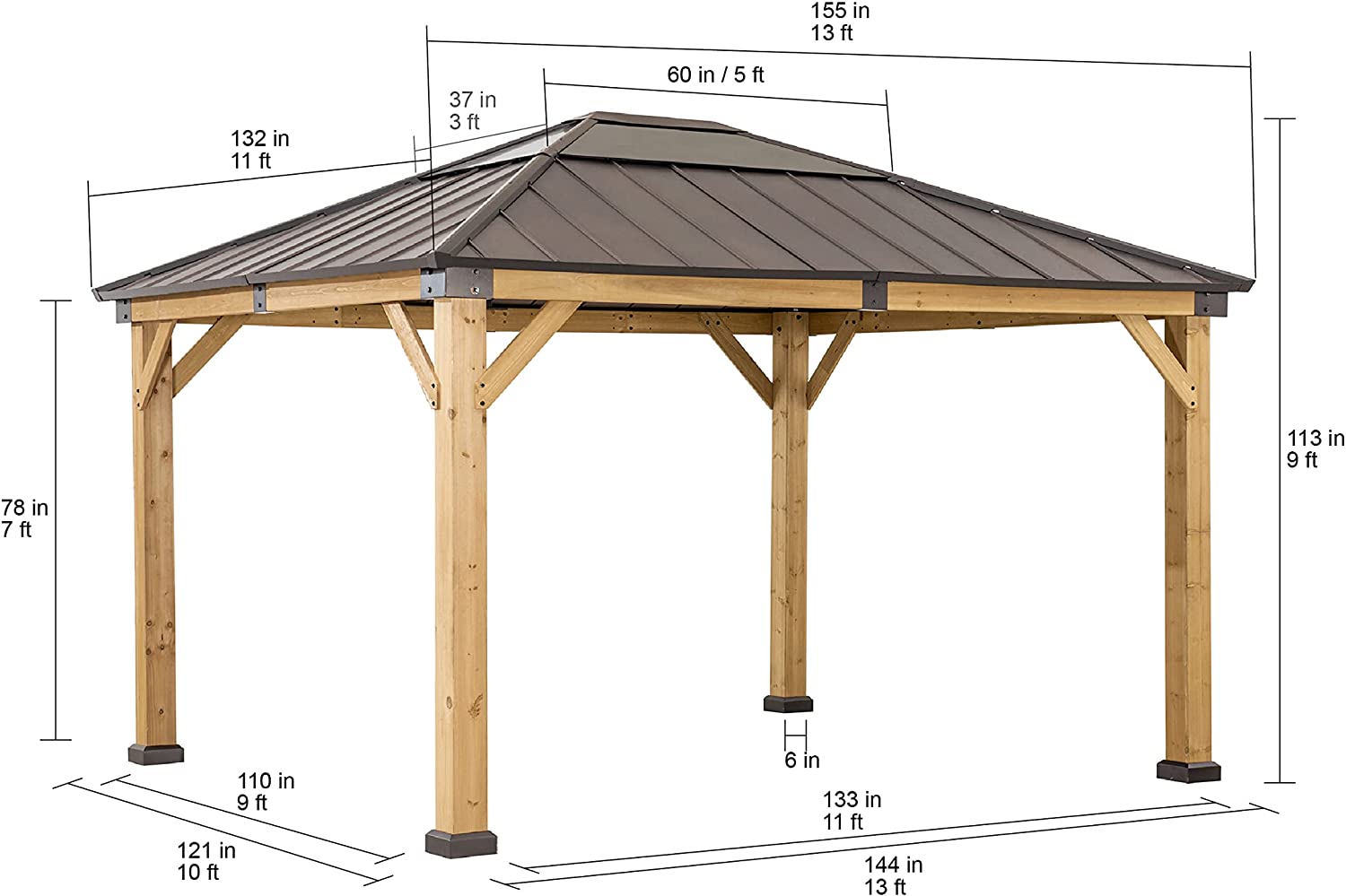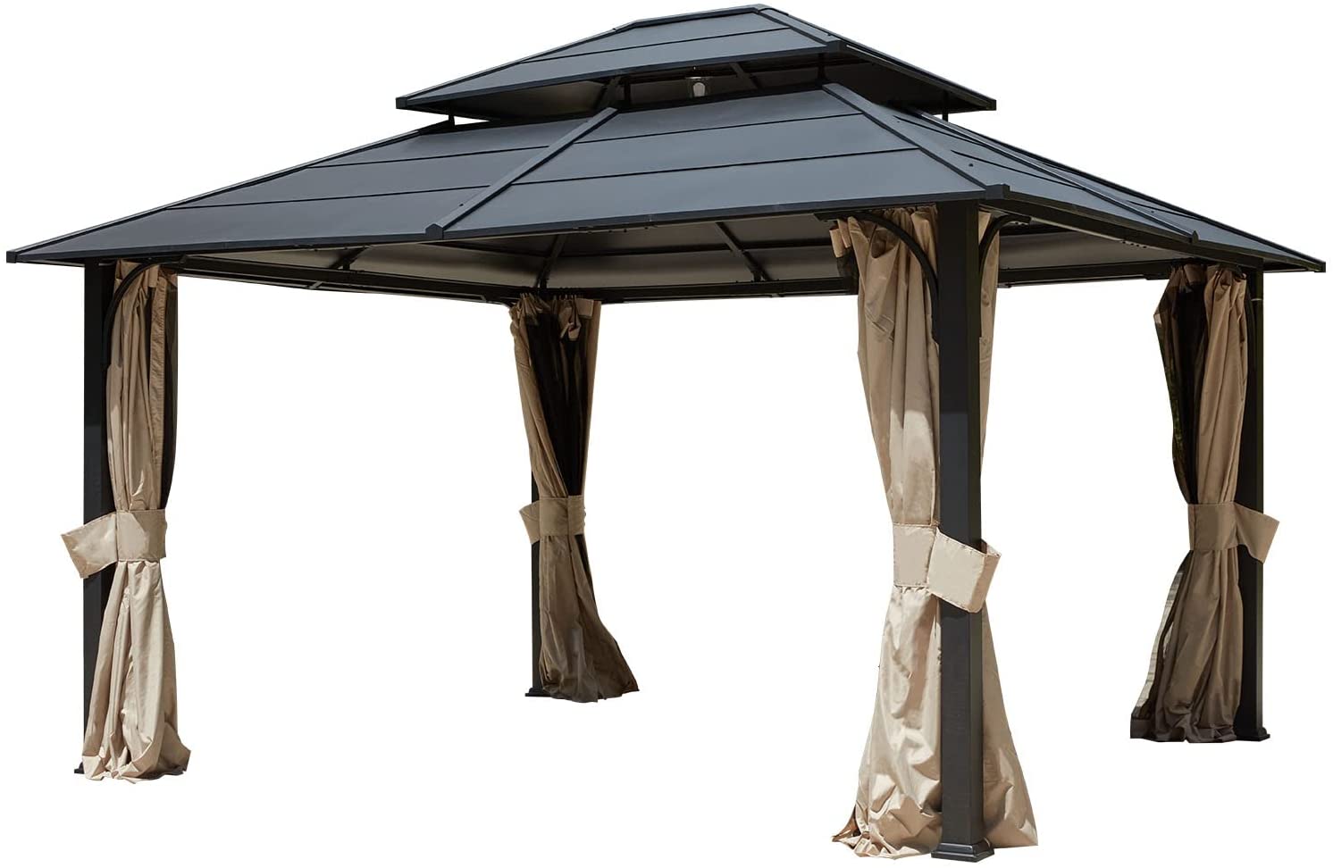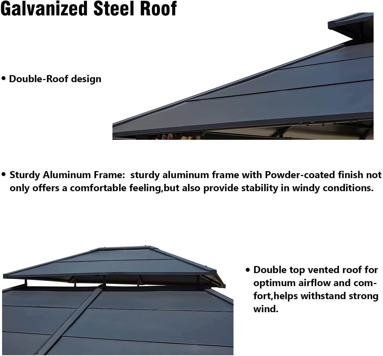 【Gazebo】10.5x12.5 ft. Outdoor Patio Black Steel Frame Hardtop Gazebo with 2-Tier Steel Roof & Mesh Netting