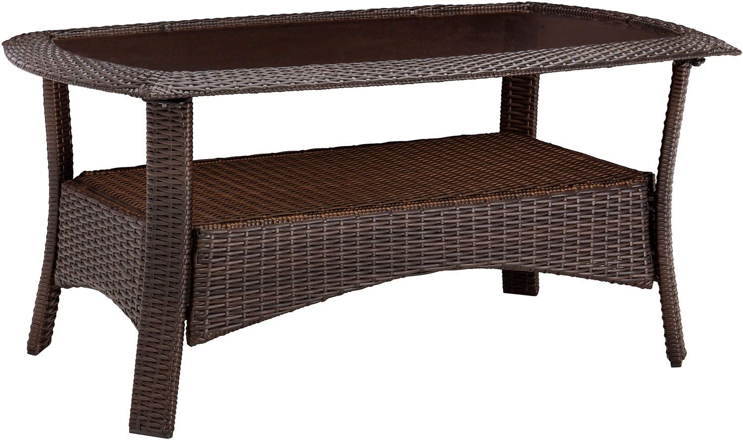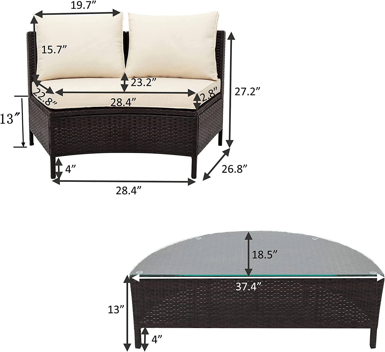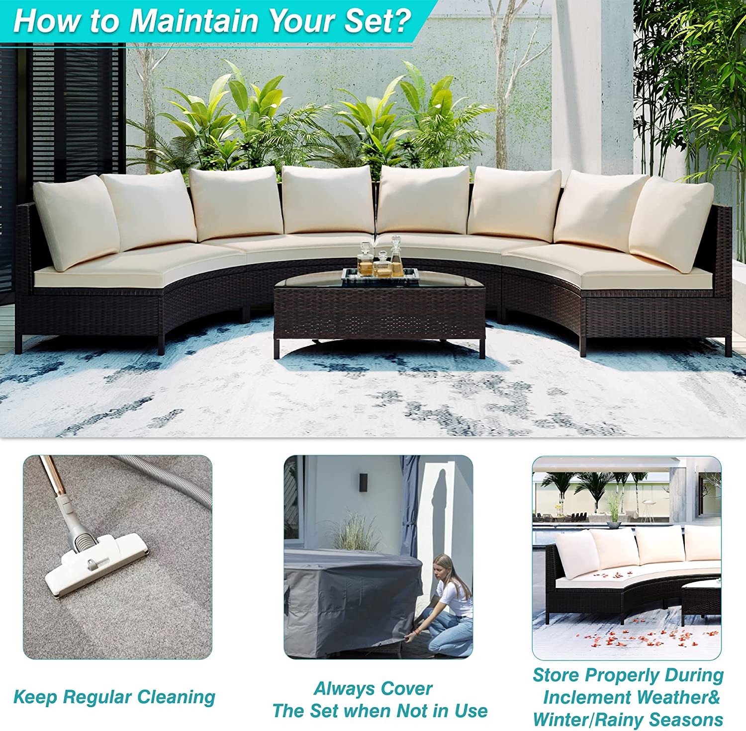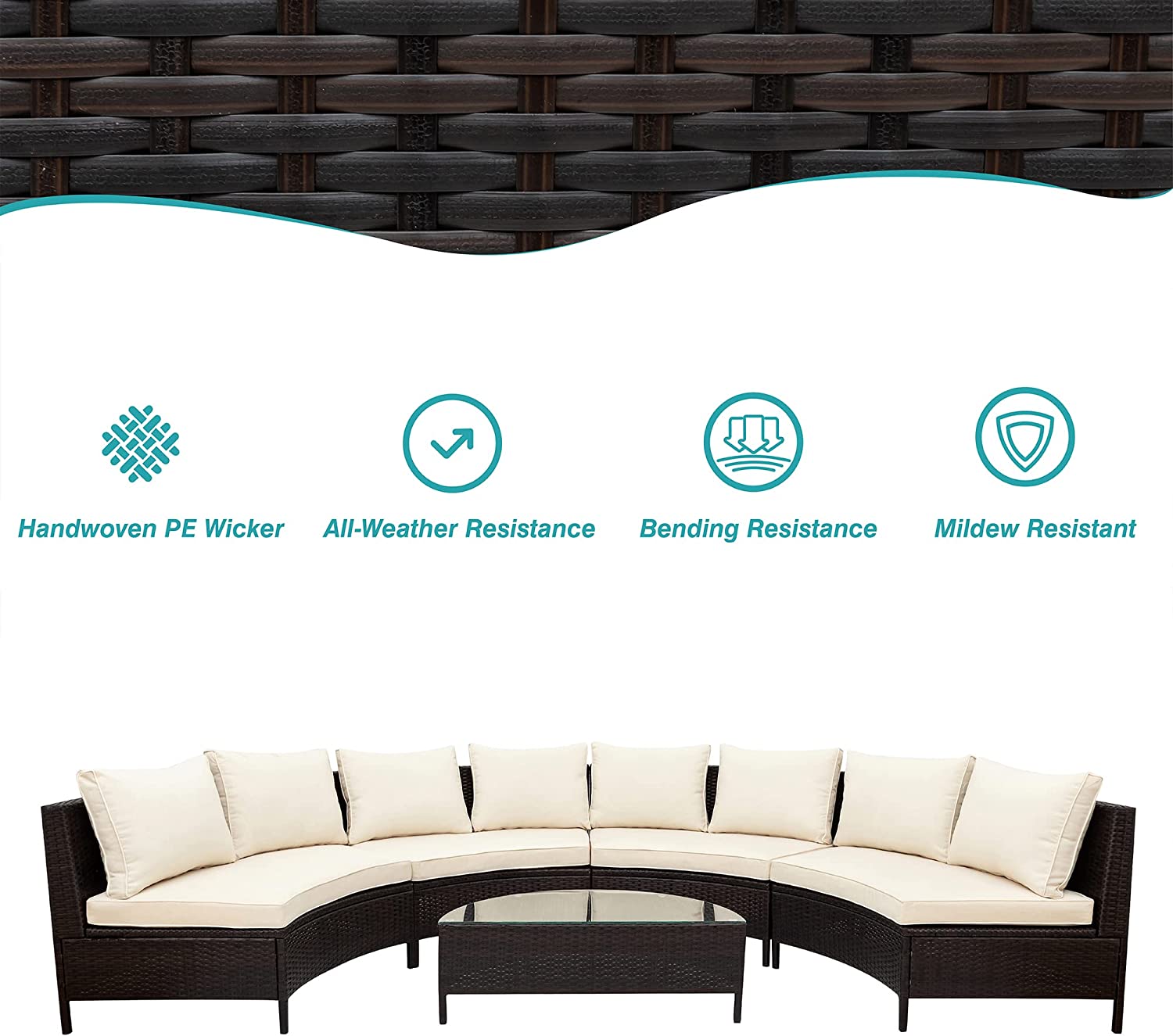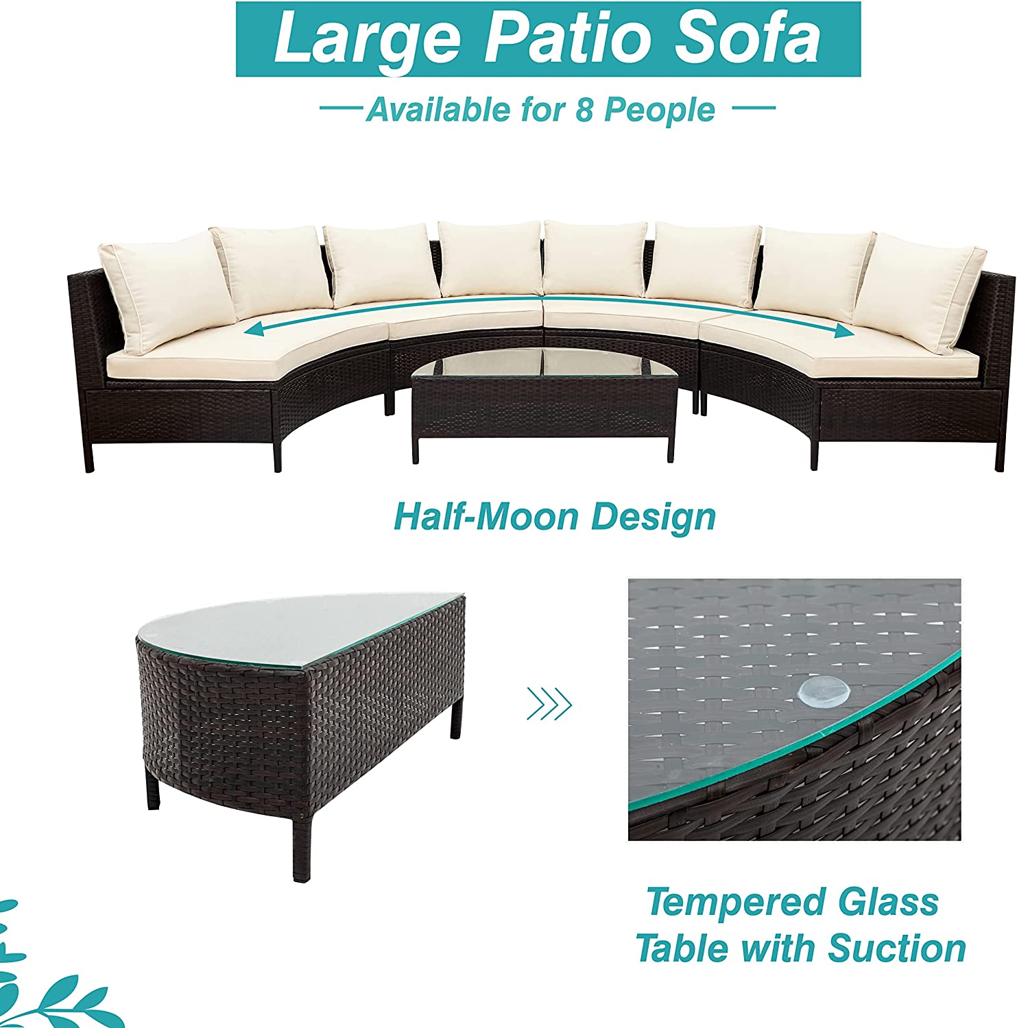 GODAFA 8 Seating Outdoor Patio Furniture Sectional Sofa Set, All-Weather Half-Moon with Tempered Glass Table for Backyard Porch Poolside (Brown Wicker, Gray Cushion), Beige