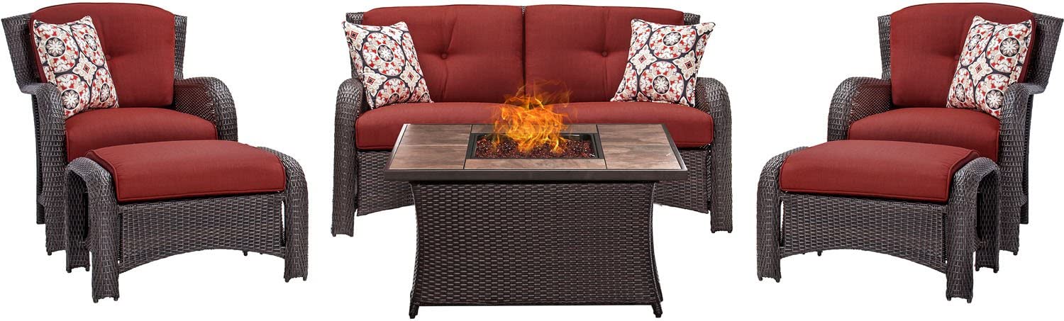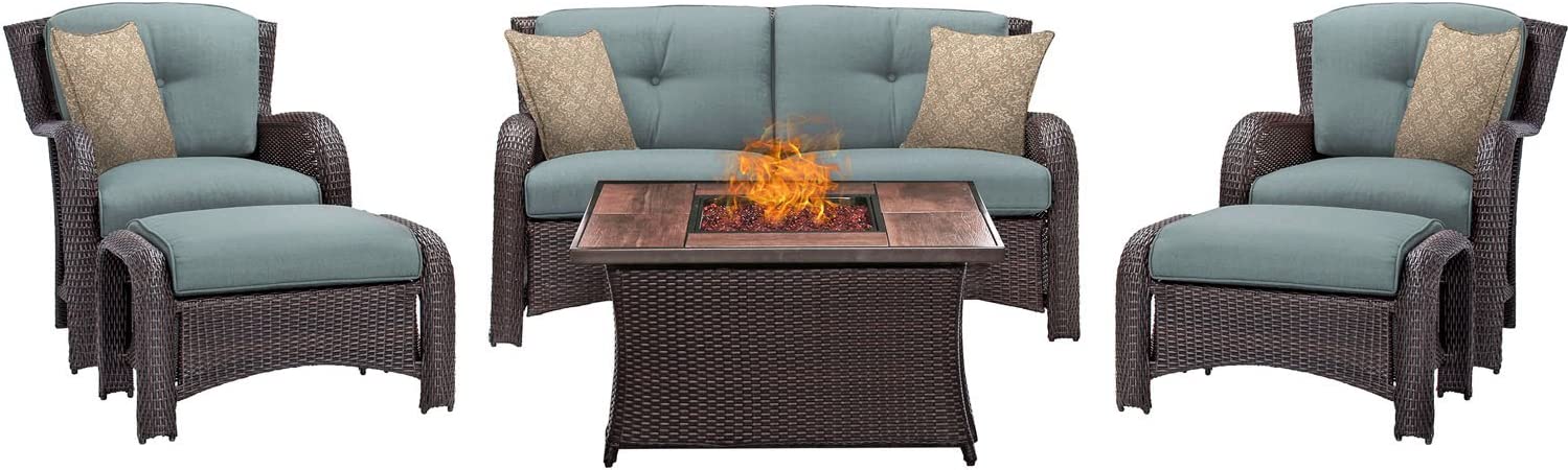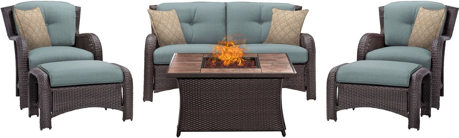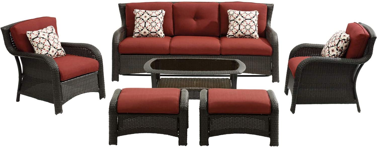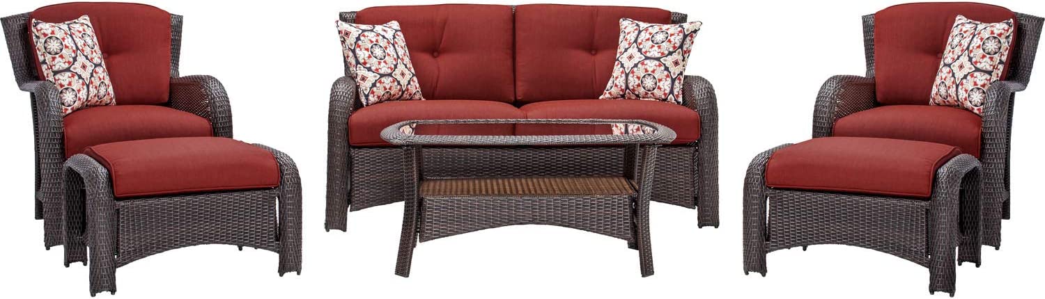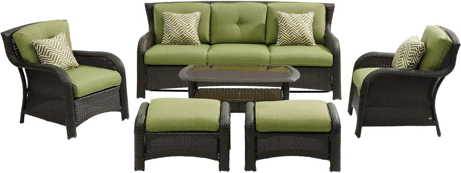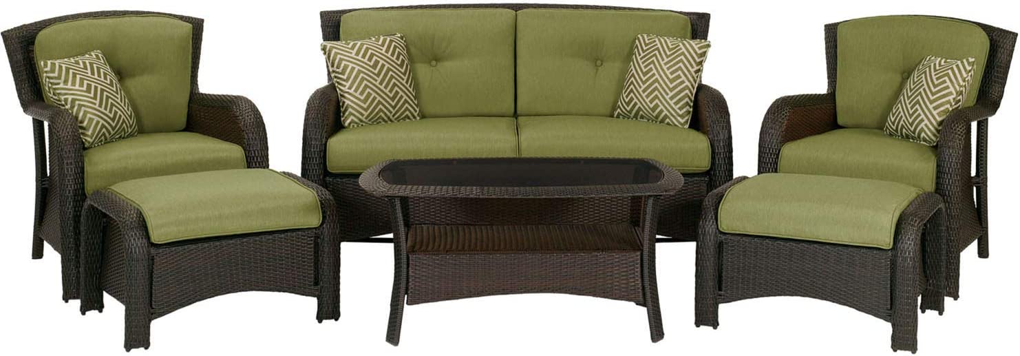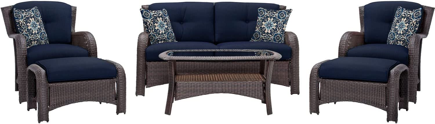 Hanover Strathmere 6-Piece Patio Conversation Set with Sofa, 2 Arm Chairs, 2 Ottomans, Accent Pillows and Tempered Glass-Top Coffee Table