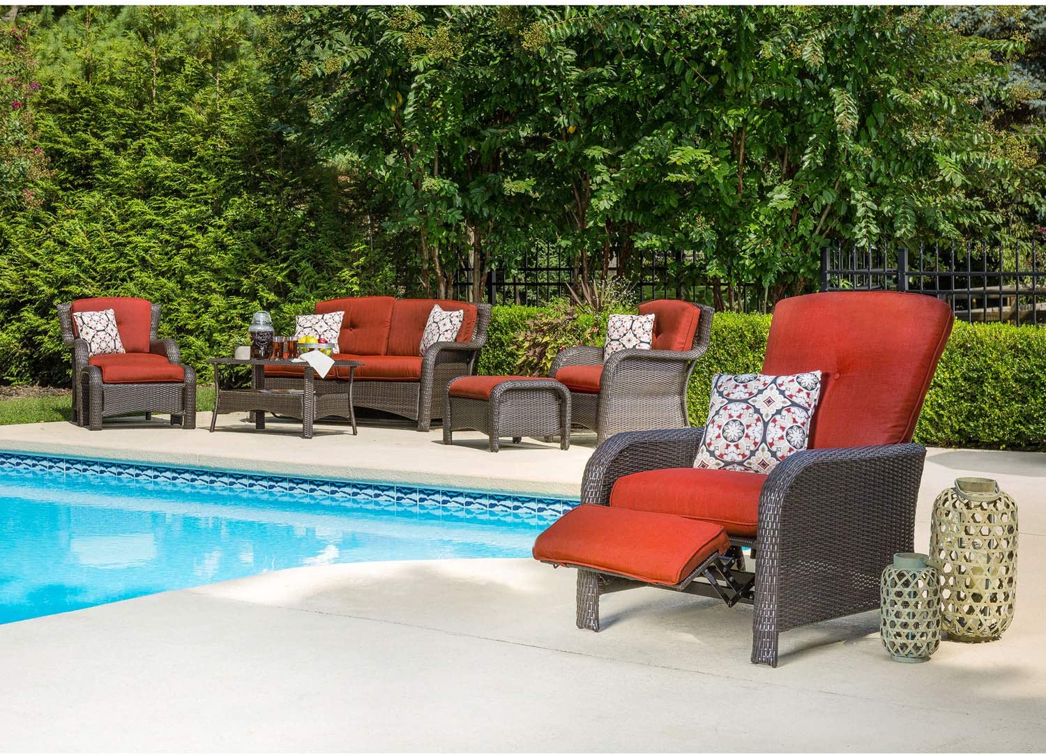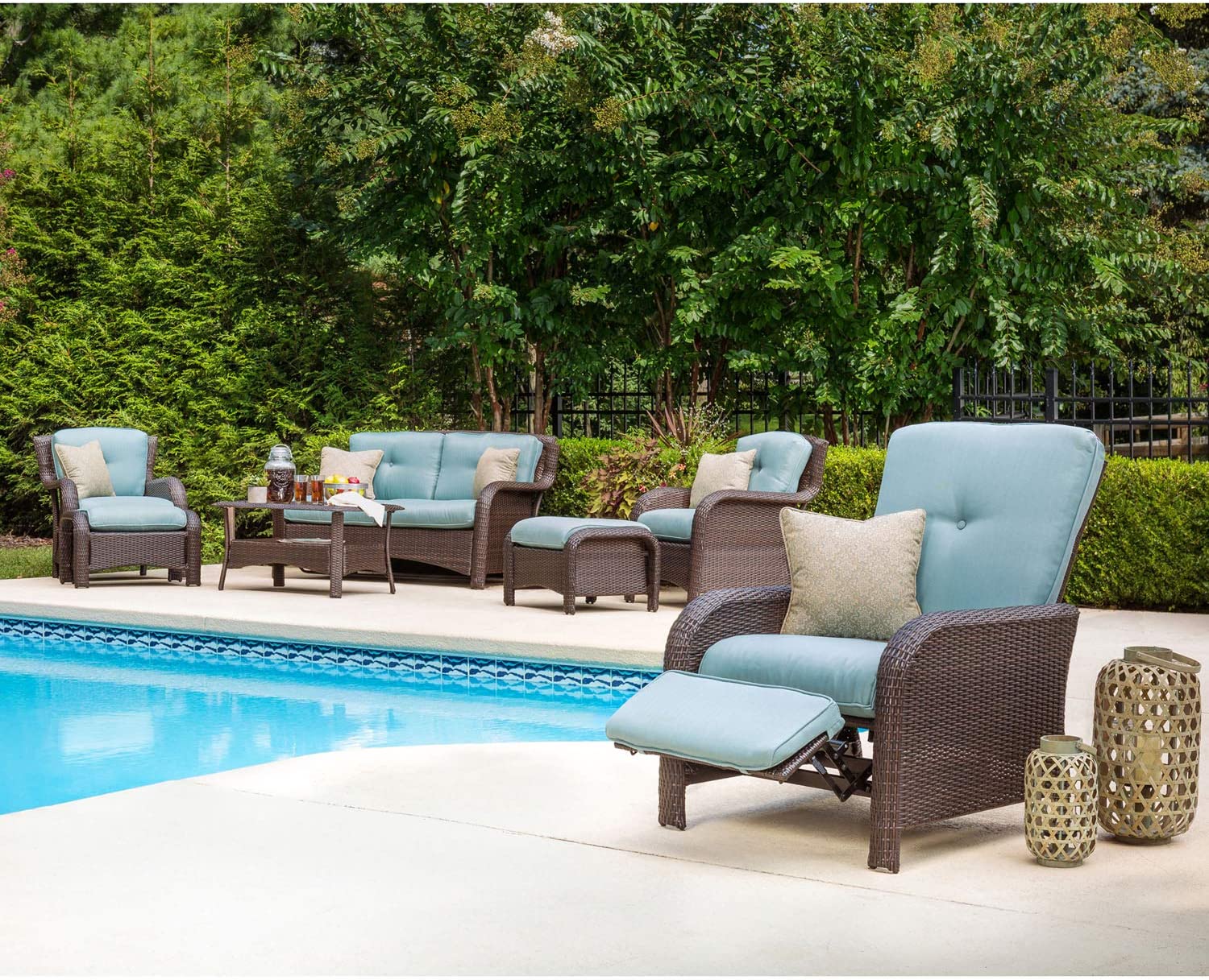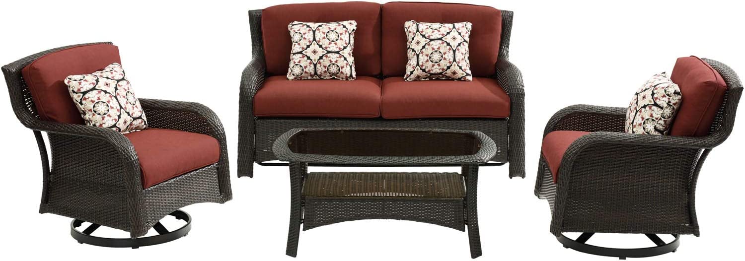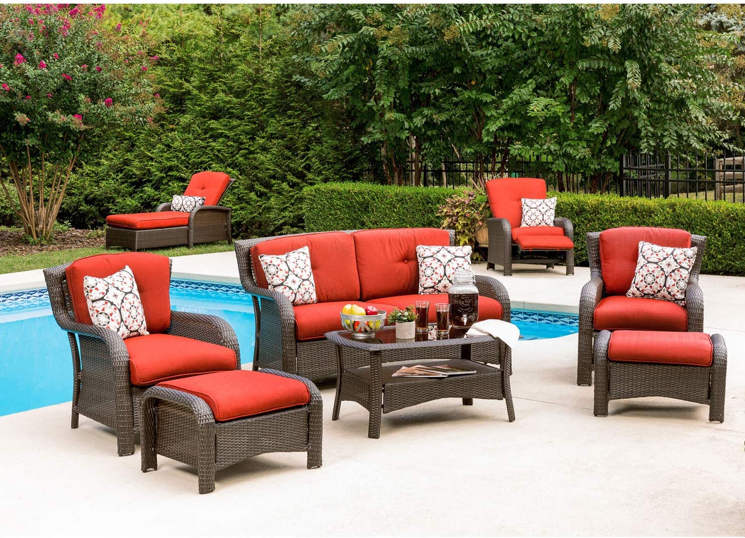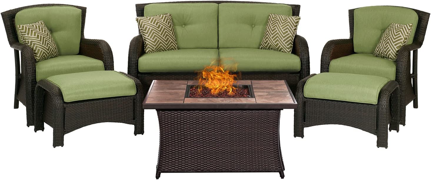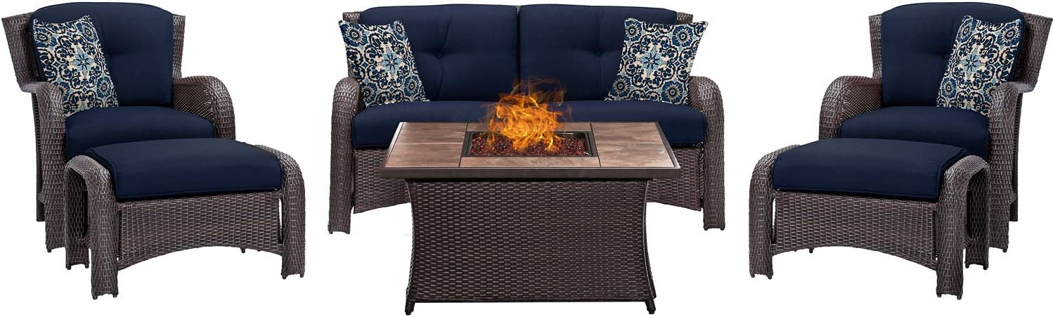 Hanover Strathmere 6-Piece Patio Conversation Set with Sofa, 2 Arm Chairs, 2 Ottomans, Accent Pillows and Tempered Glass-Top Coffee Table