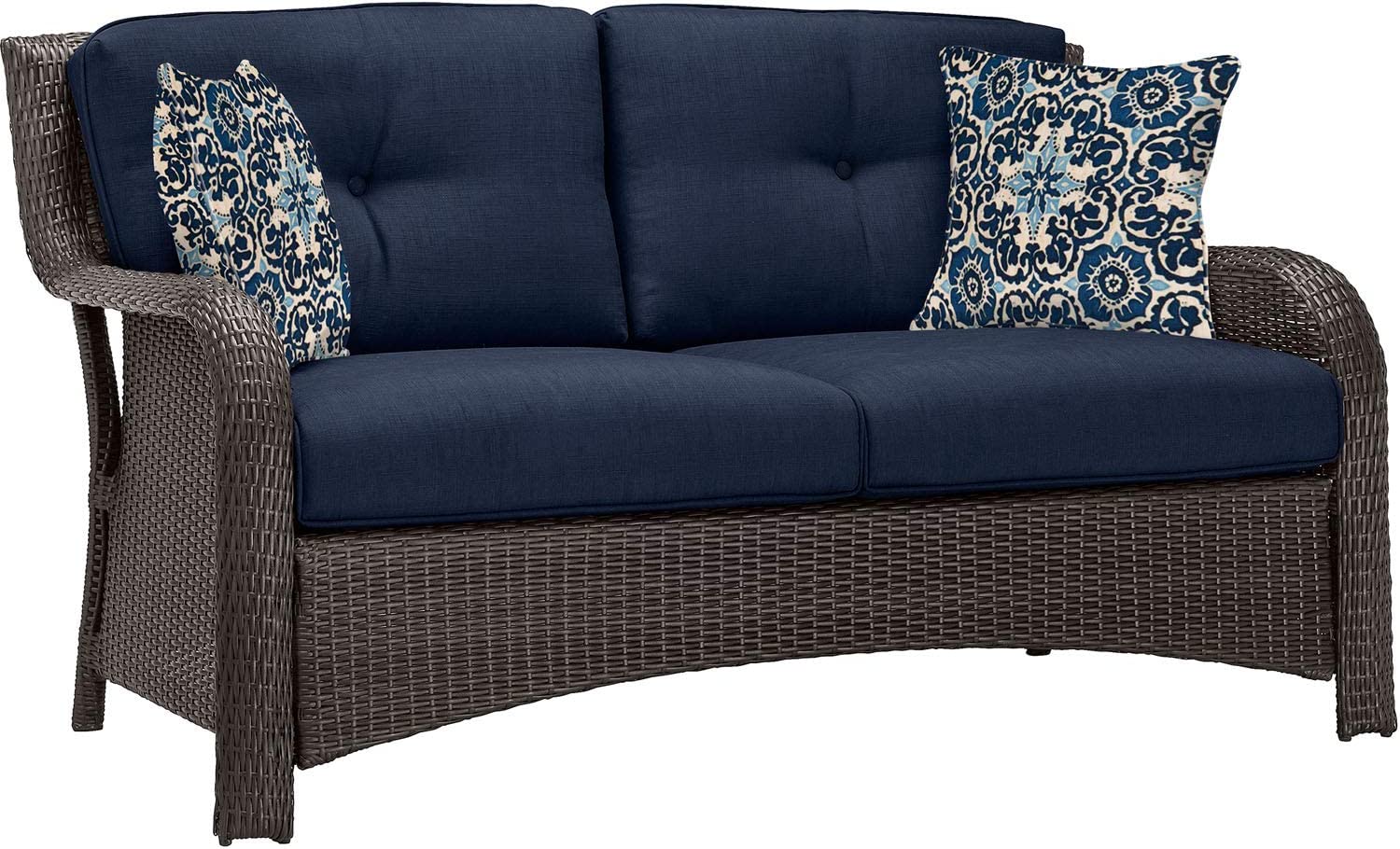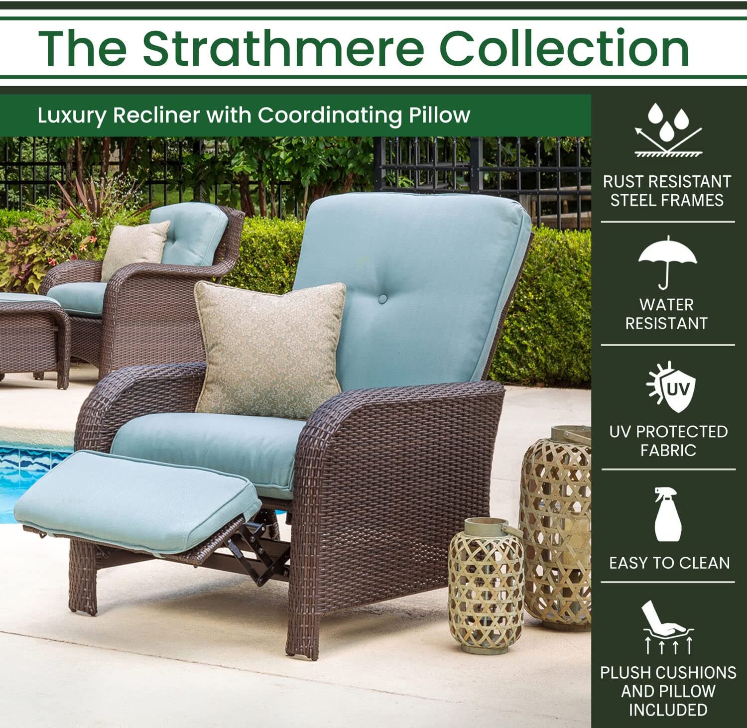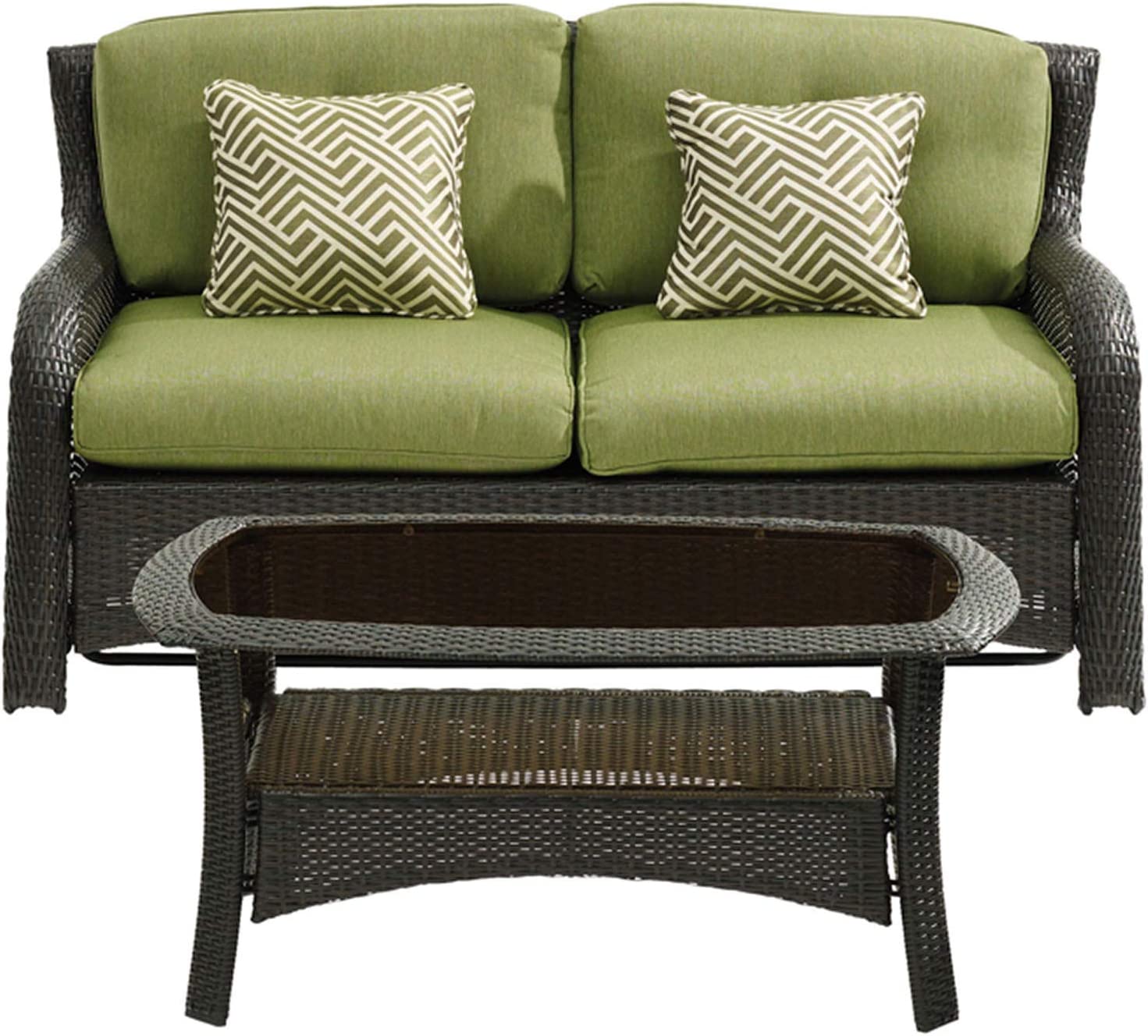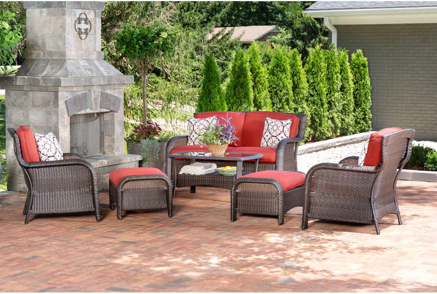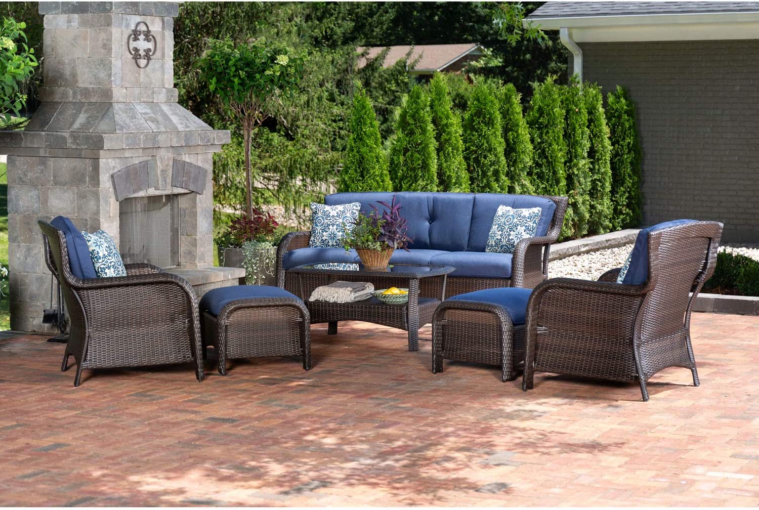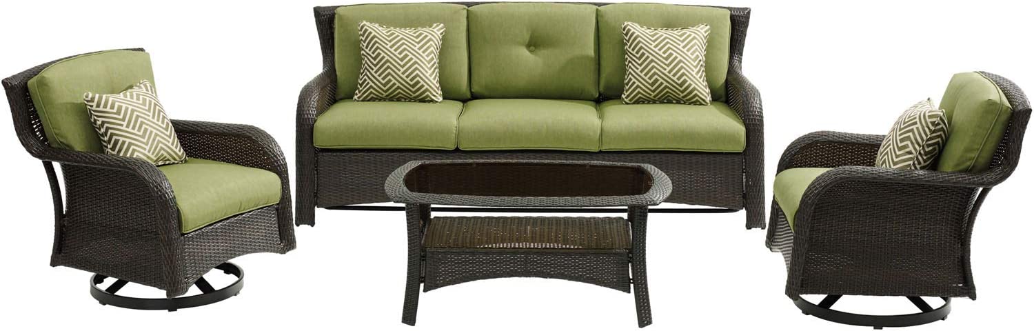 Hanover Strathmere 6-Piece Patio Conversation Set with Sofa, 2 Arm Chairs, 2 Ottomans, Accent Pillows and Tempered Glass-Top Coffee Table
