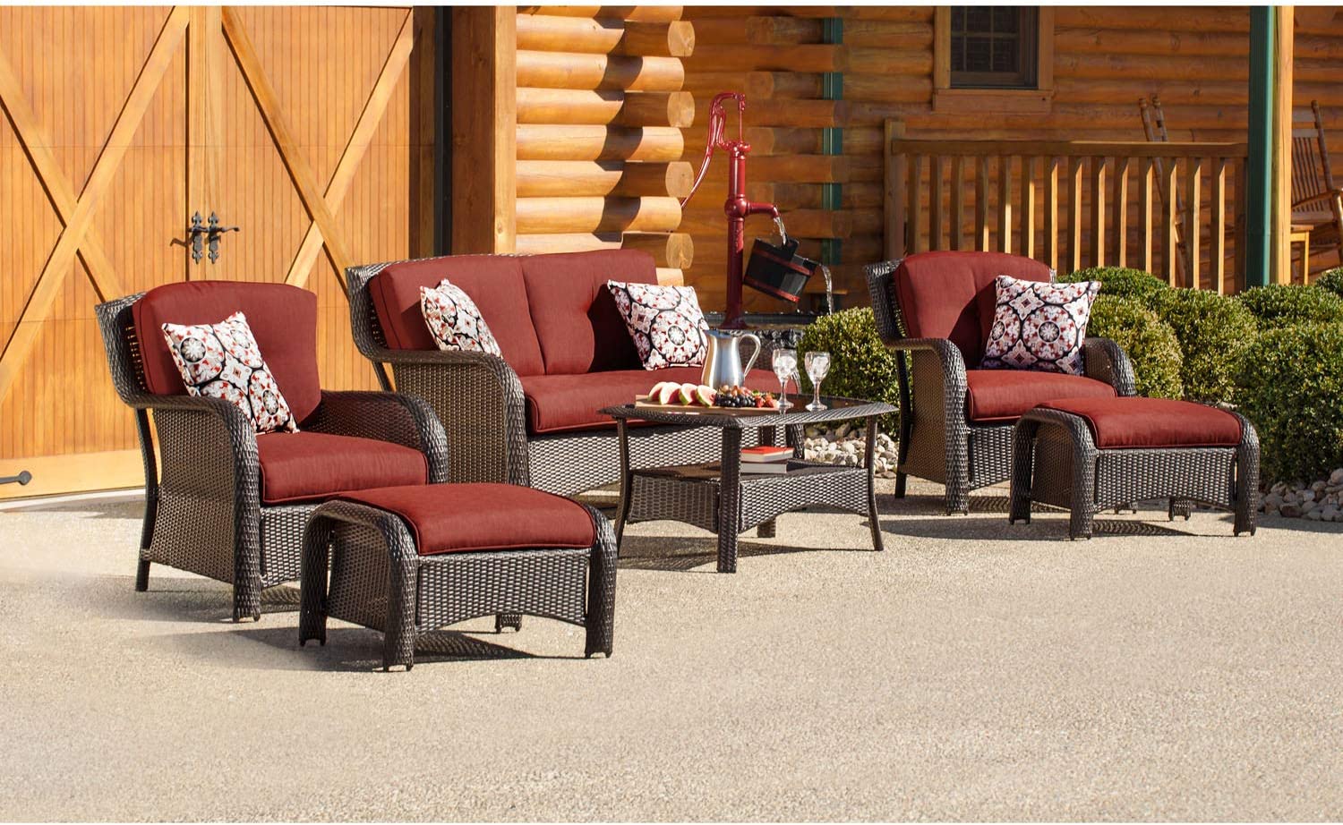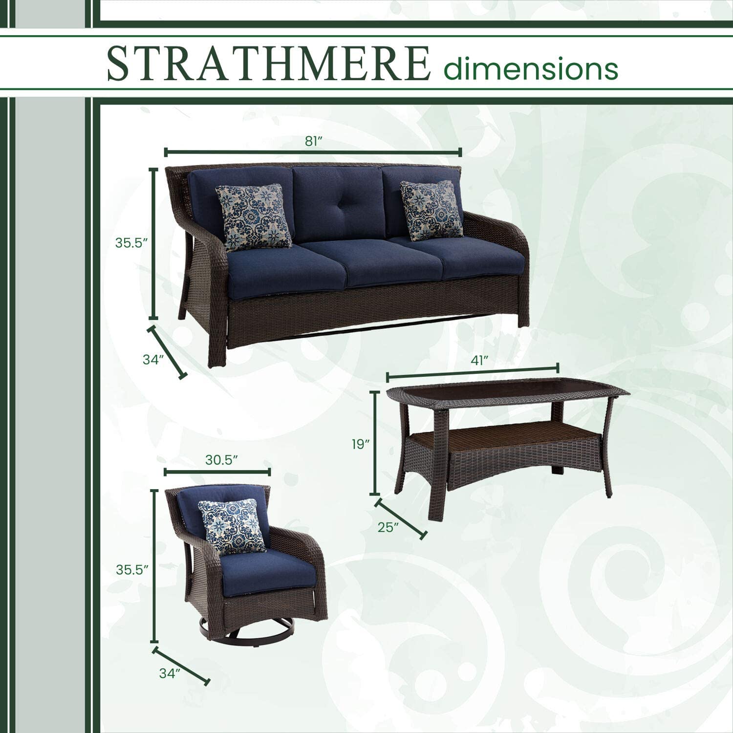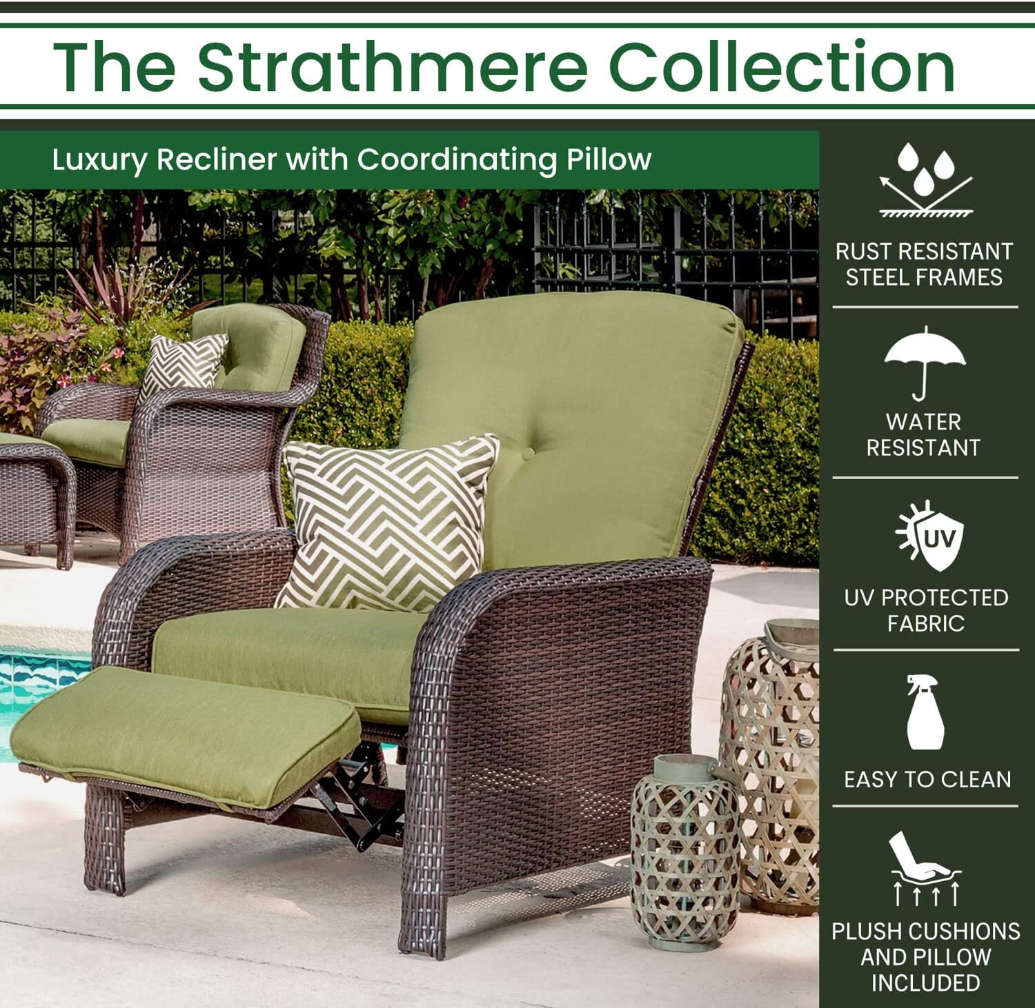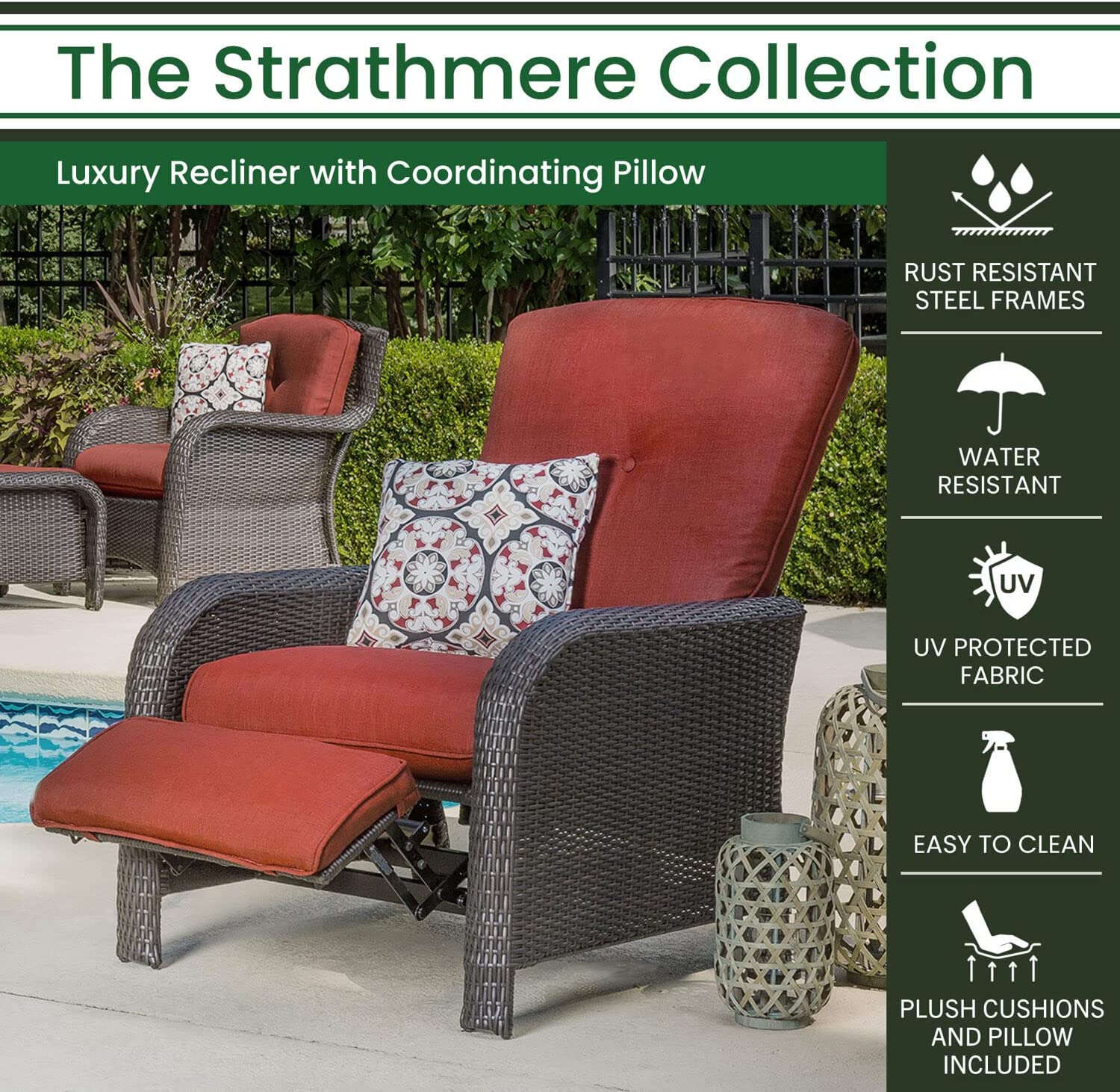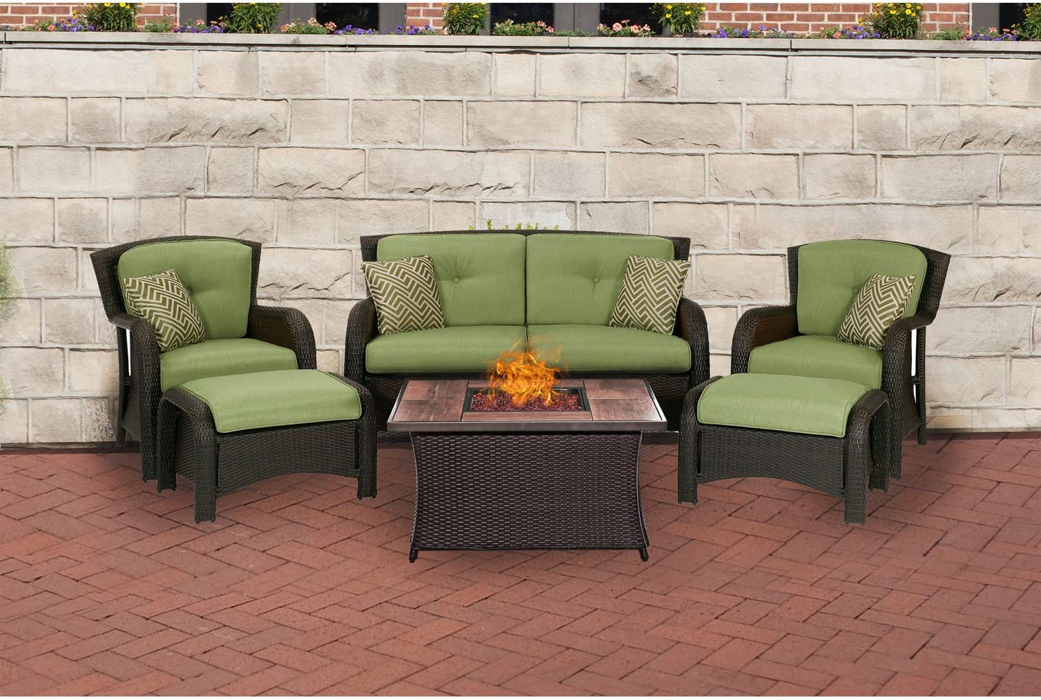 Hanover Strathmere 6-Piece Patio Conversation Set with Sofa, 2 Arm Chairs, 2 Ottomans, Accent Pillows and Tempered Glass-Top Coffee Table