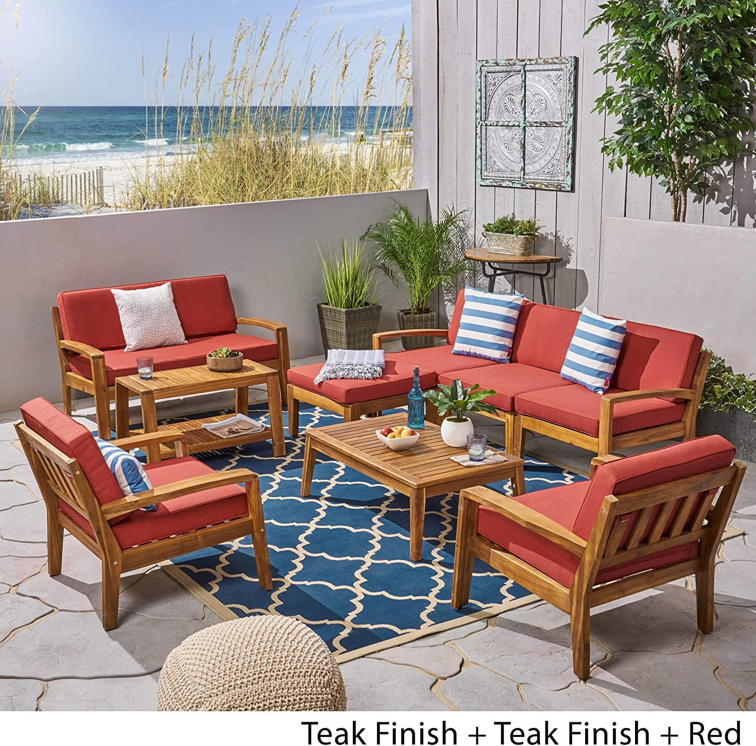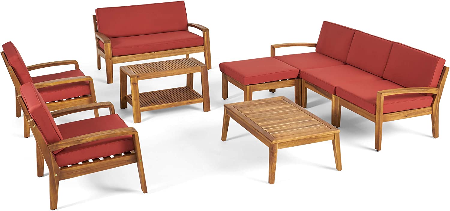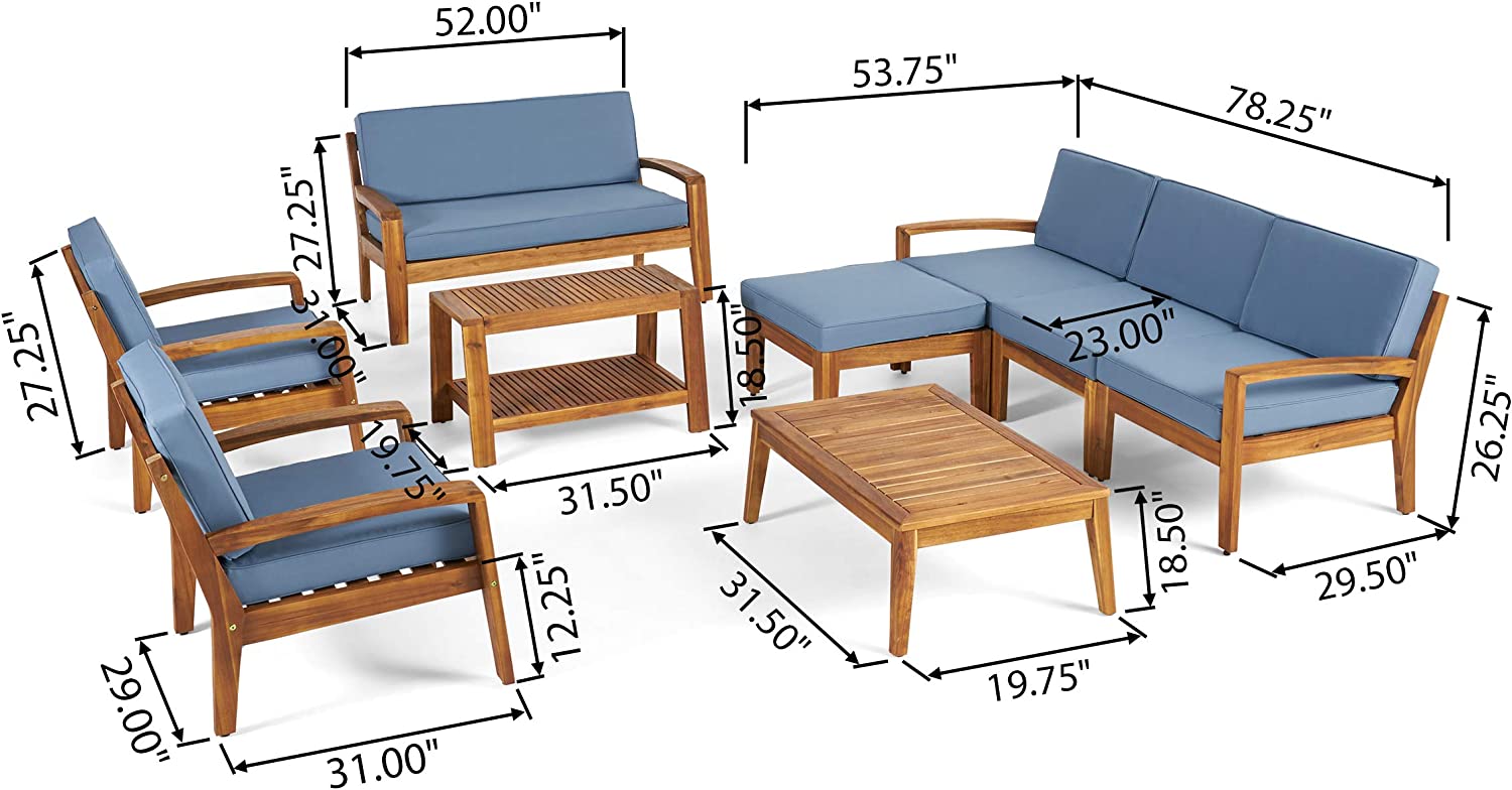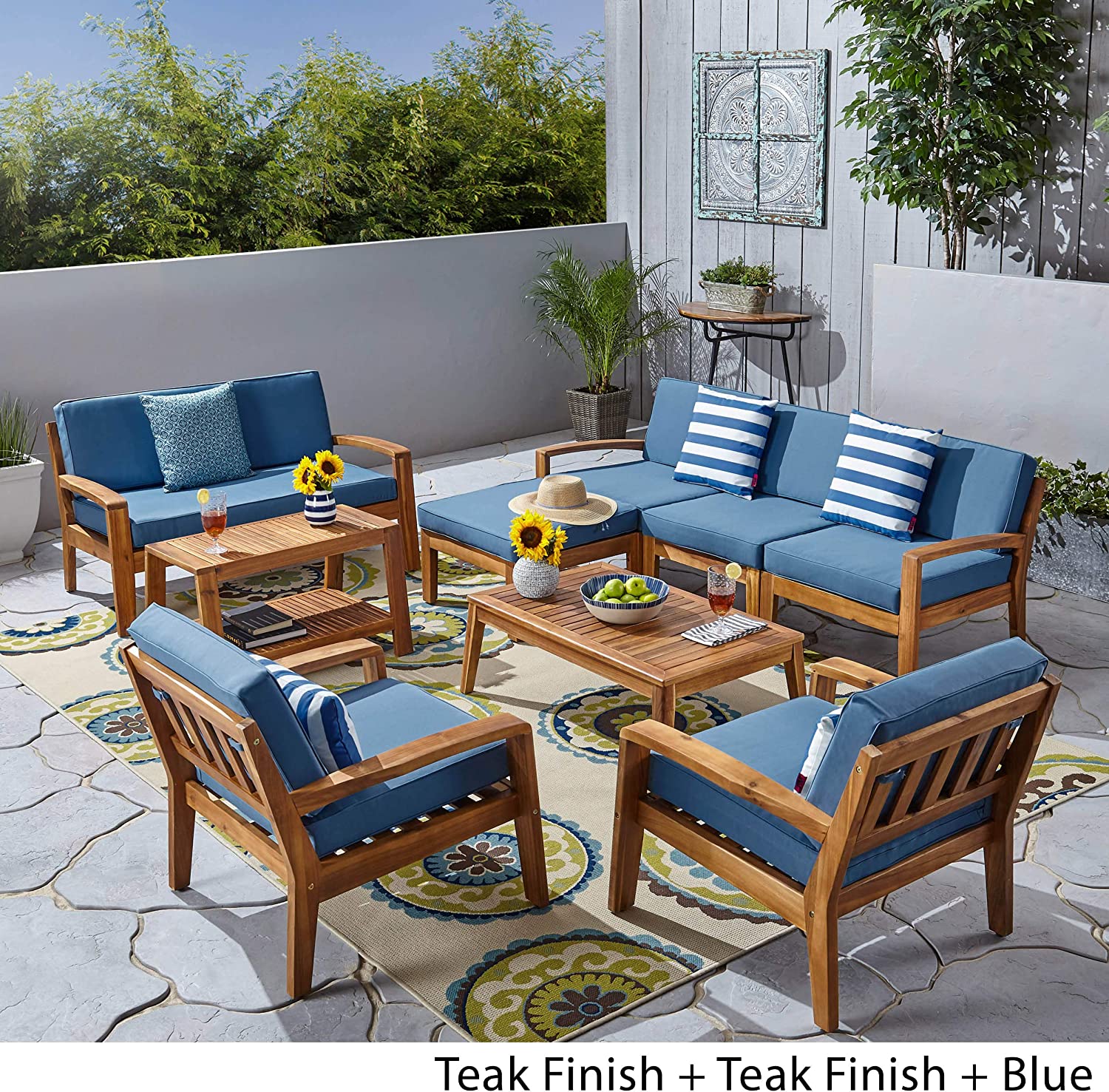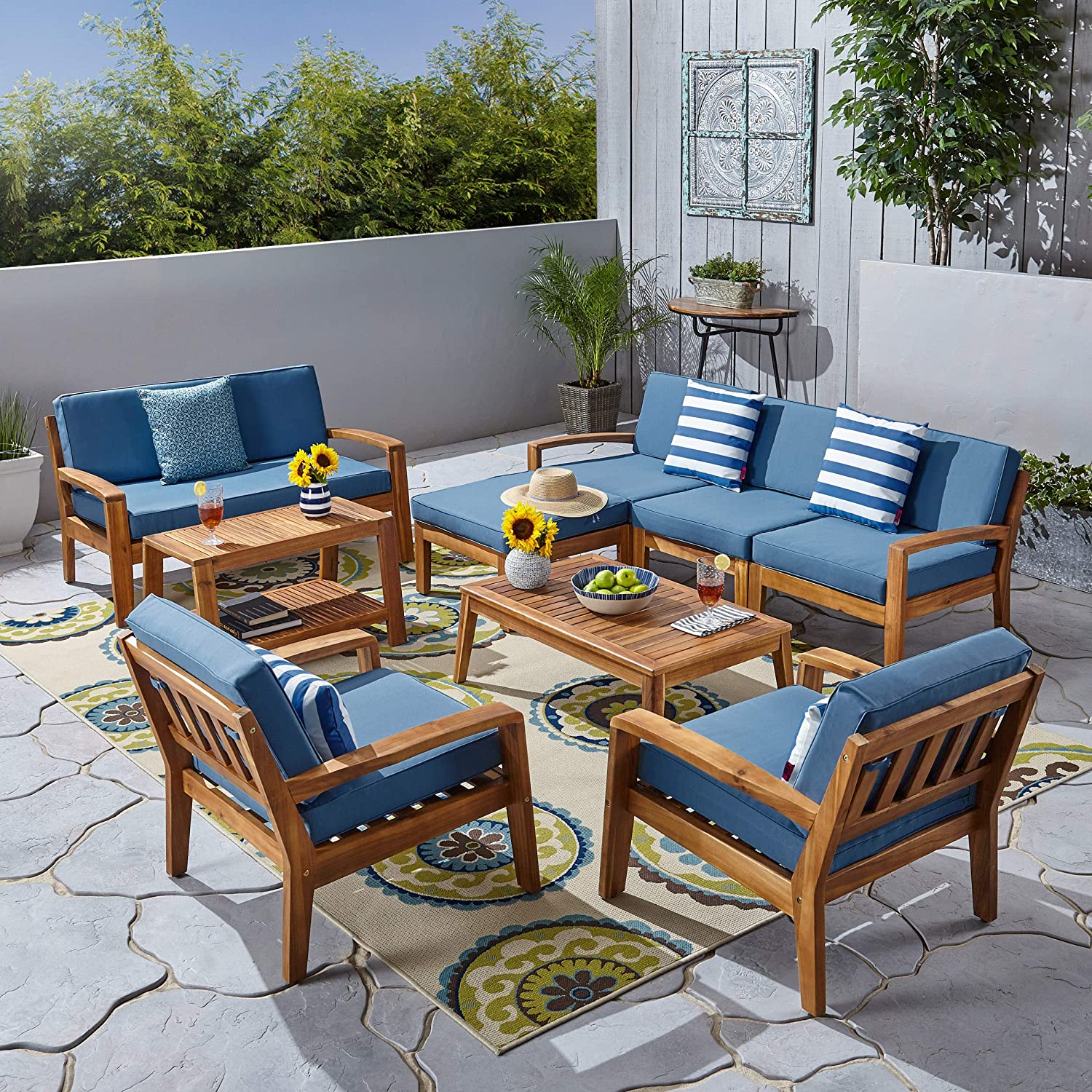 Great Deal Furniture Sally 7-Seater Sectional Sofa Set for Patio with Loveseat, Club Chairs, Ottoman, and Coffee Tables, Acacia Wood, Teak Finish with Blue Outdoor Cushions