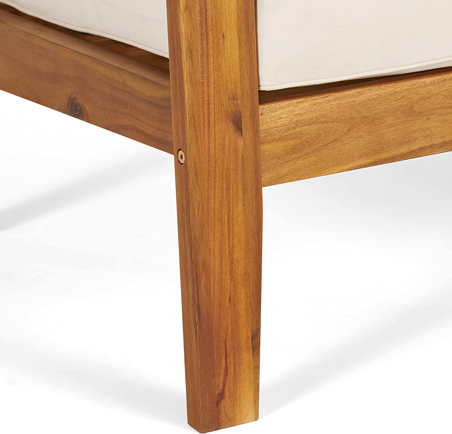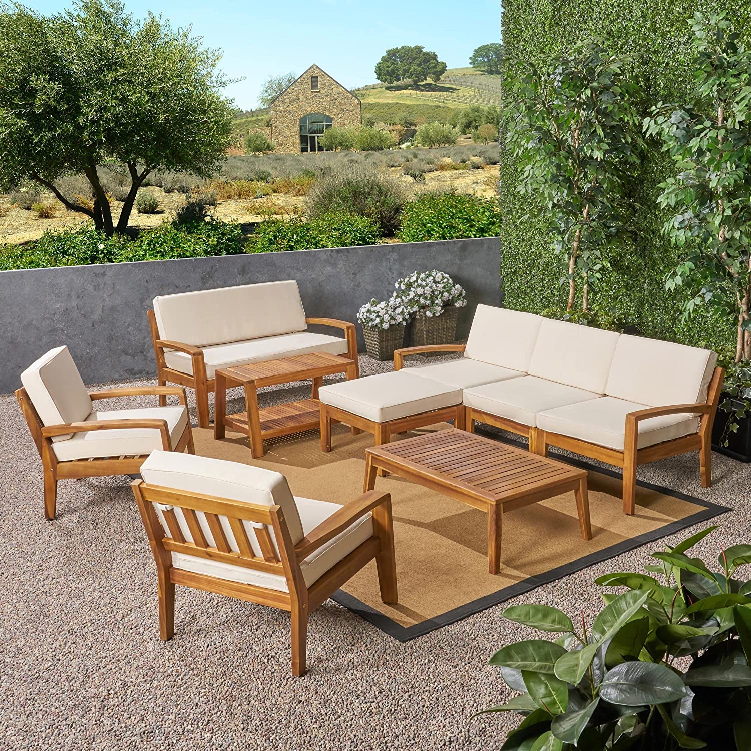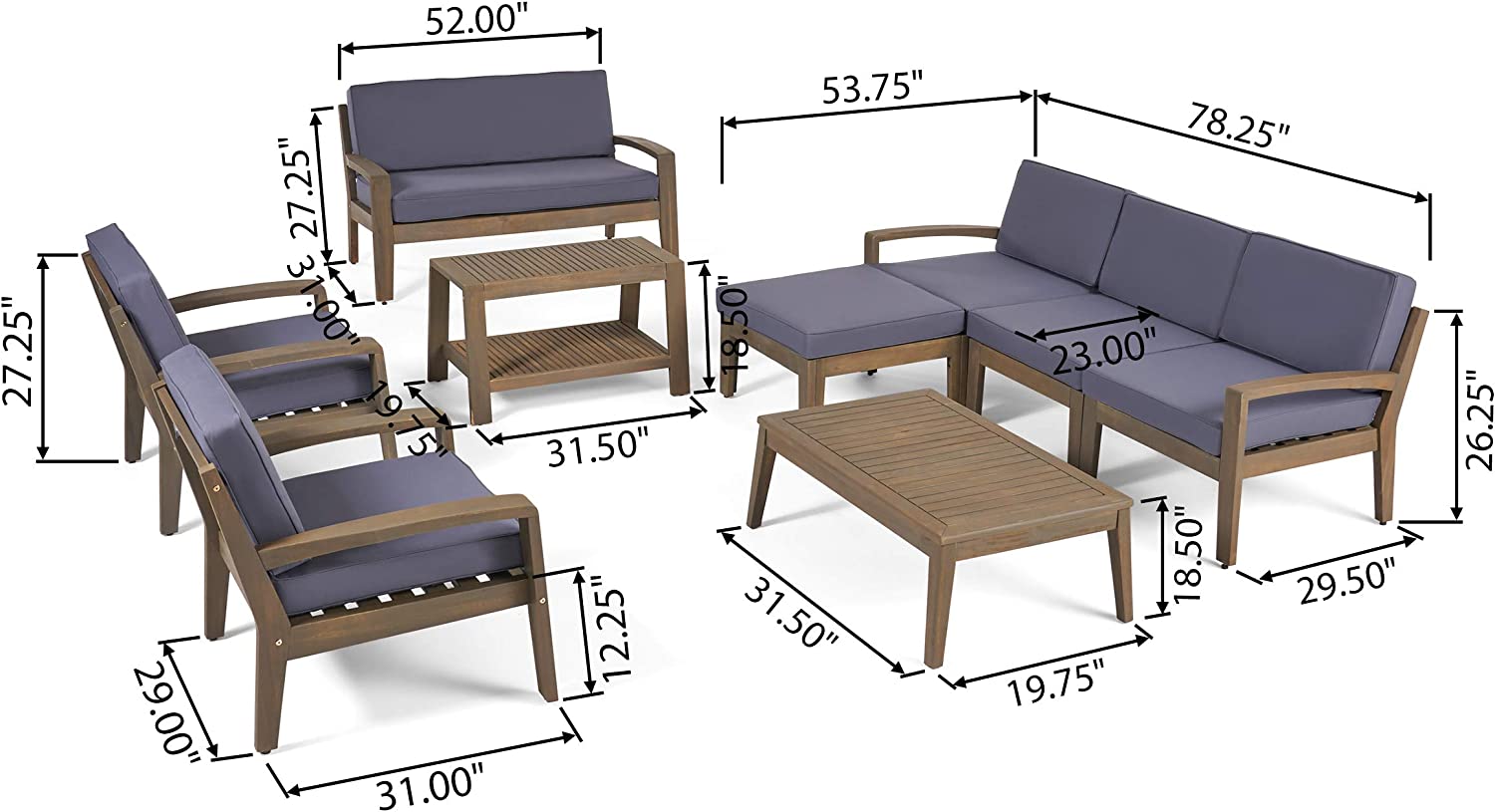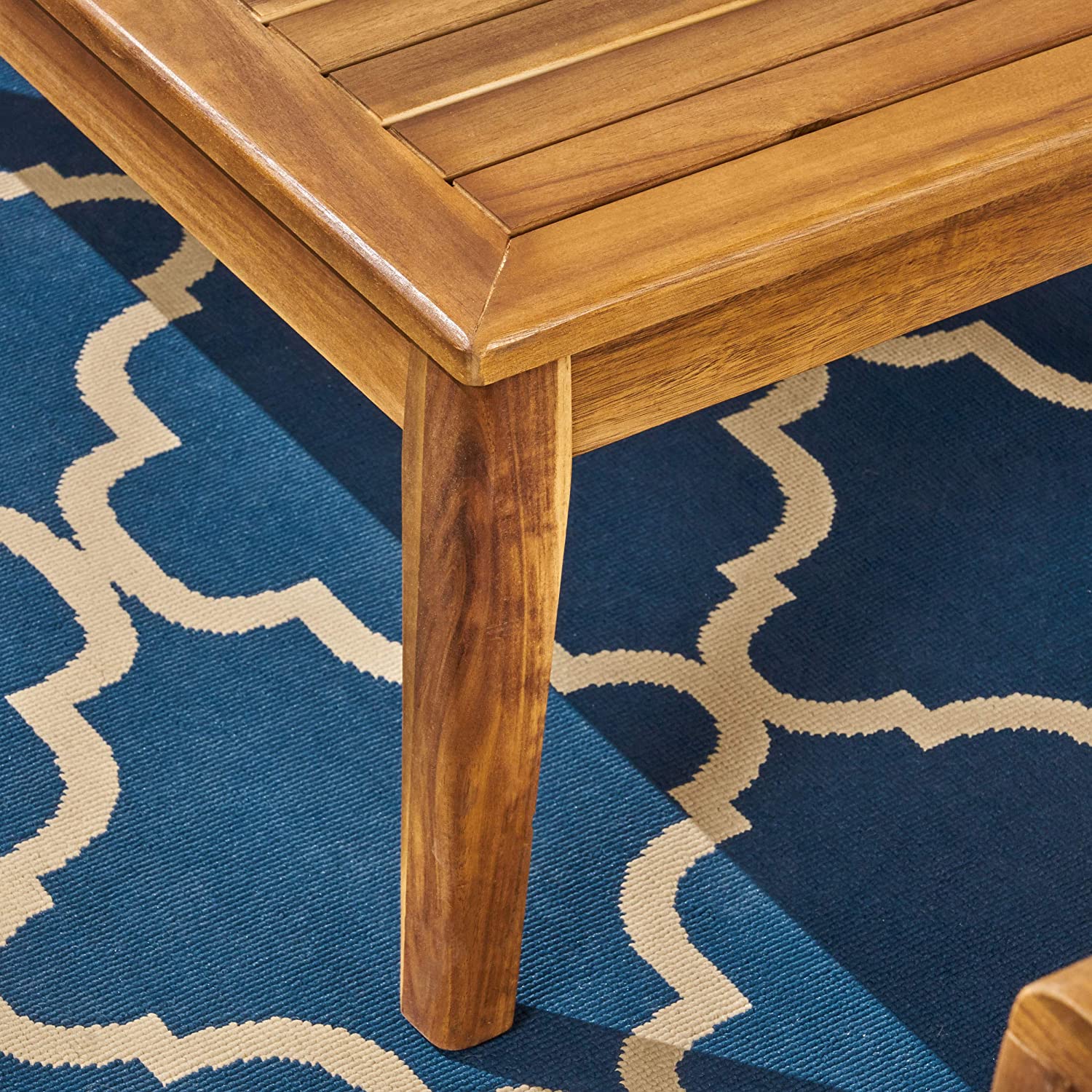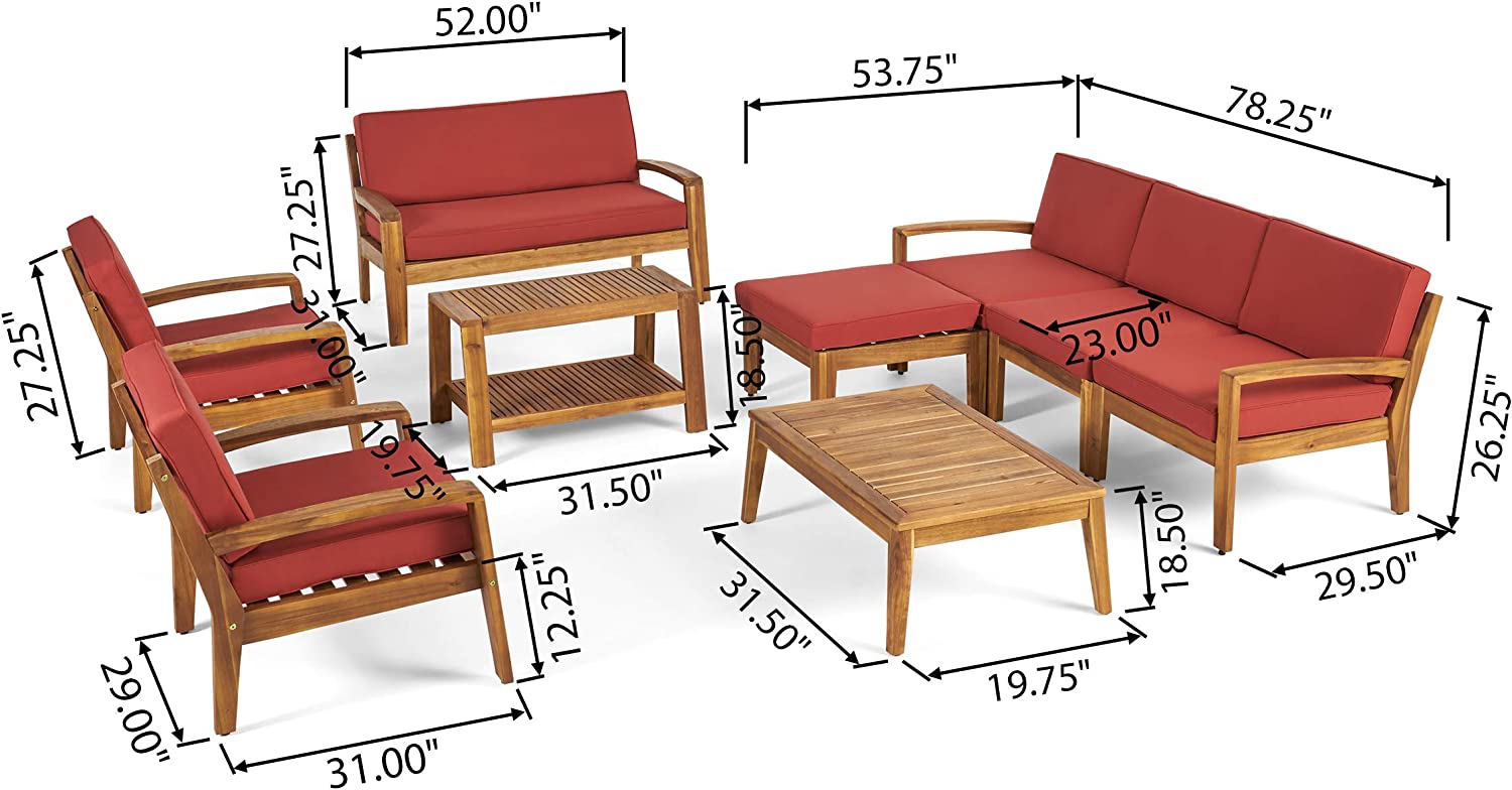 Great Deal Furniture Sally 7-Seater Sectional Sofa Set for Patio with Loveseat, Club Chairs, Ottoman, and Coffee Tables, Acacia Wood, Teak Finish with Blue Outdoor Cushions