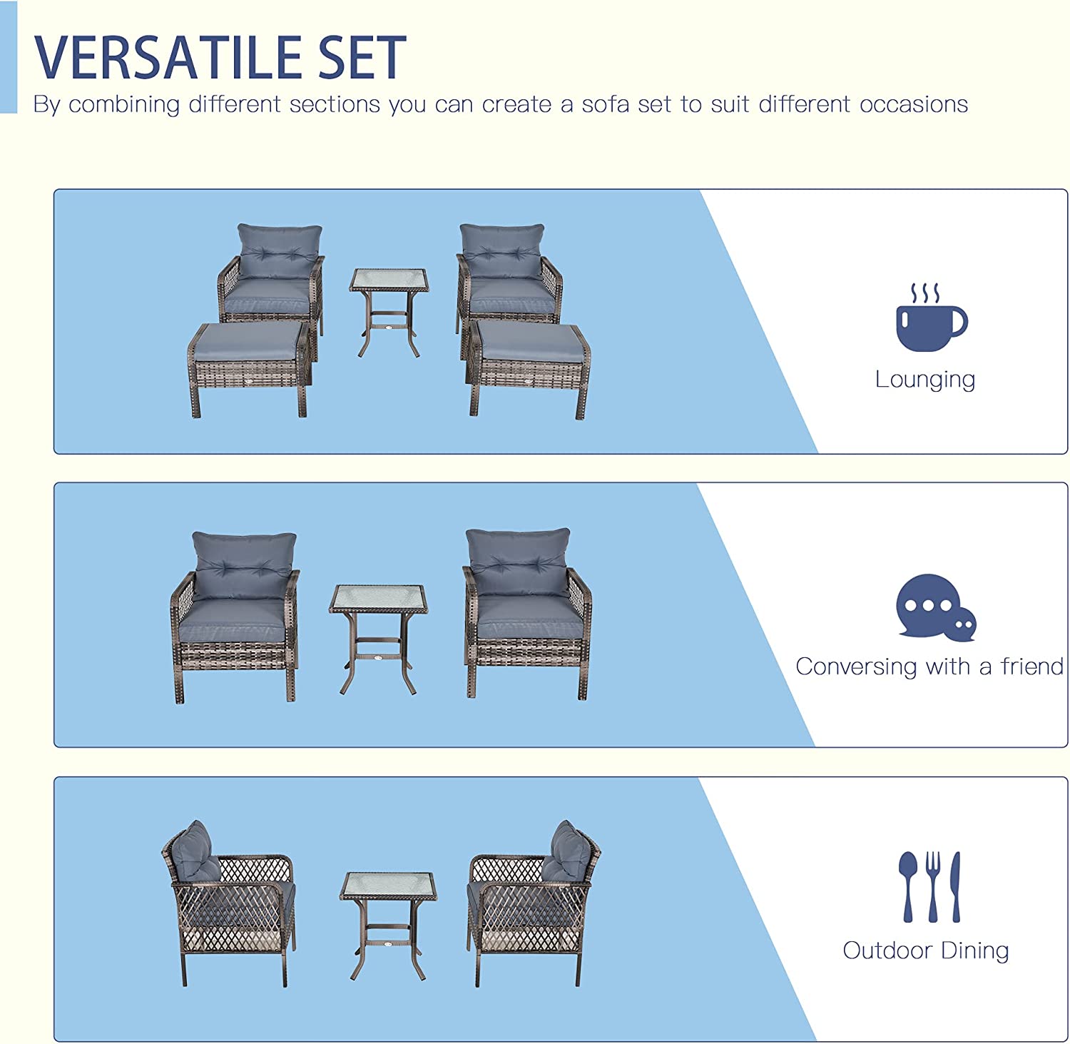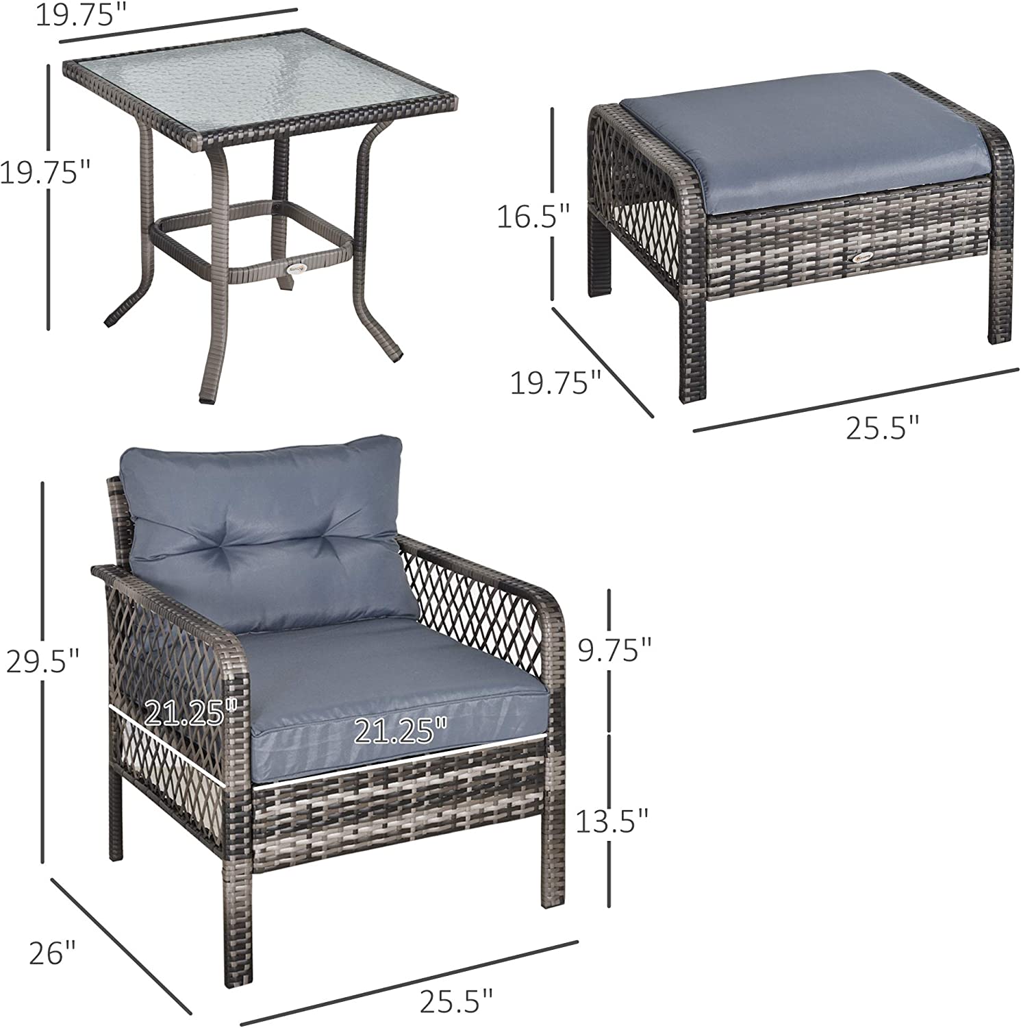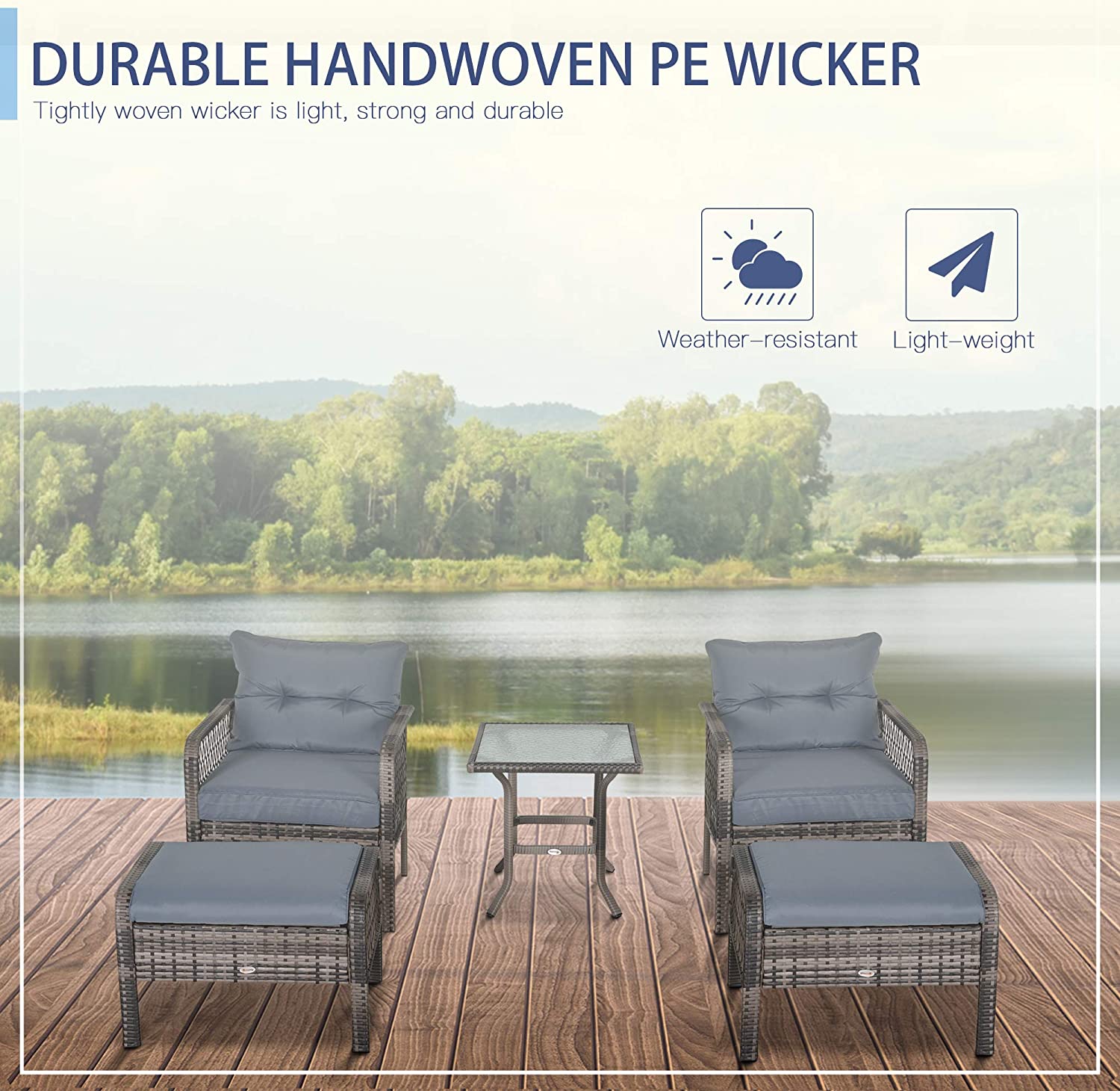 Outsunny 5-Piece Wicker Patio Armchair Set with Ottoman, Outdoor PE Rattan Furniture Set with Comfortable Zippered Cushions & Weather-Fighting Build, Grey