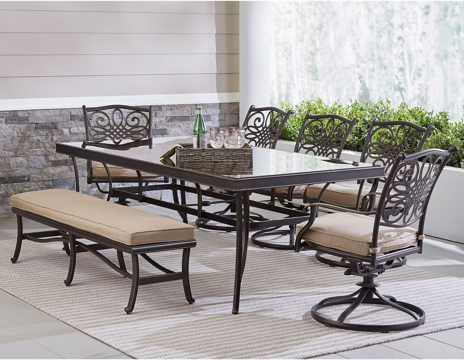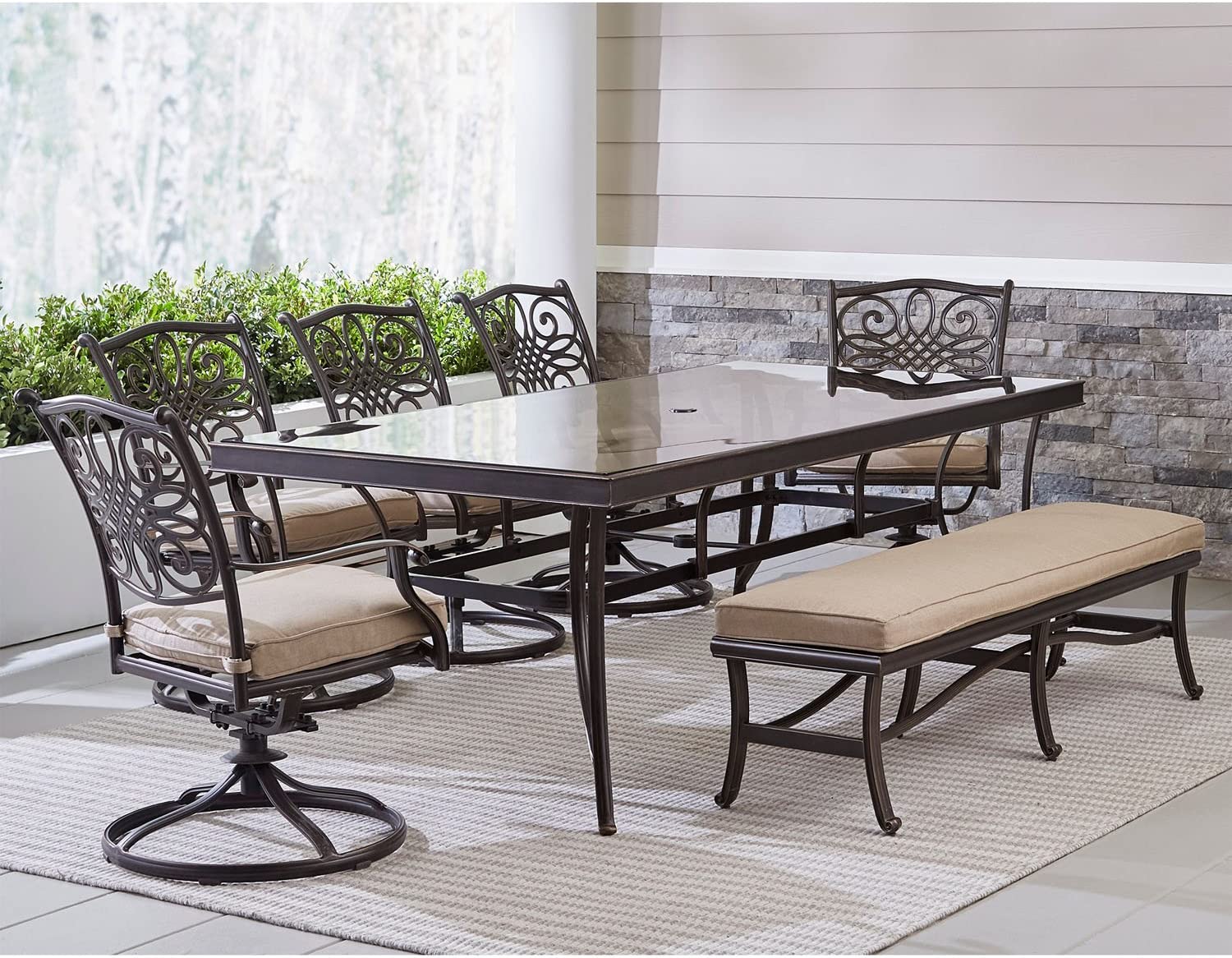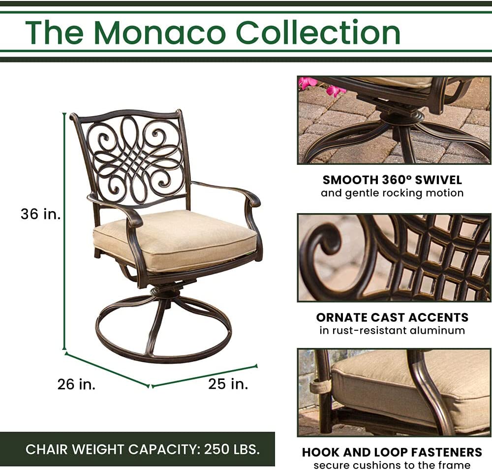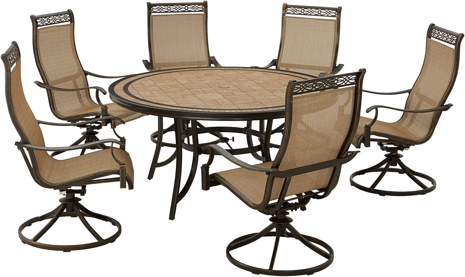 Hanover Montclair 7-Piece All-Weather Outdoor Patio Dining Set, 6 Swivel Rocker Chairs with Comfortable Tan Seat and Lumbar Cushions, 40"x66" Stamped Rectangle Table, MCLRDN7PCSQSW6-TAN