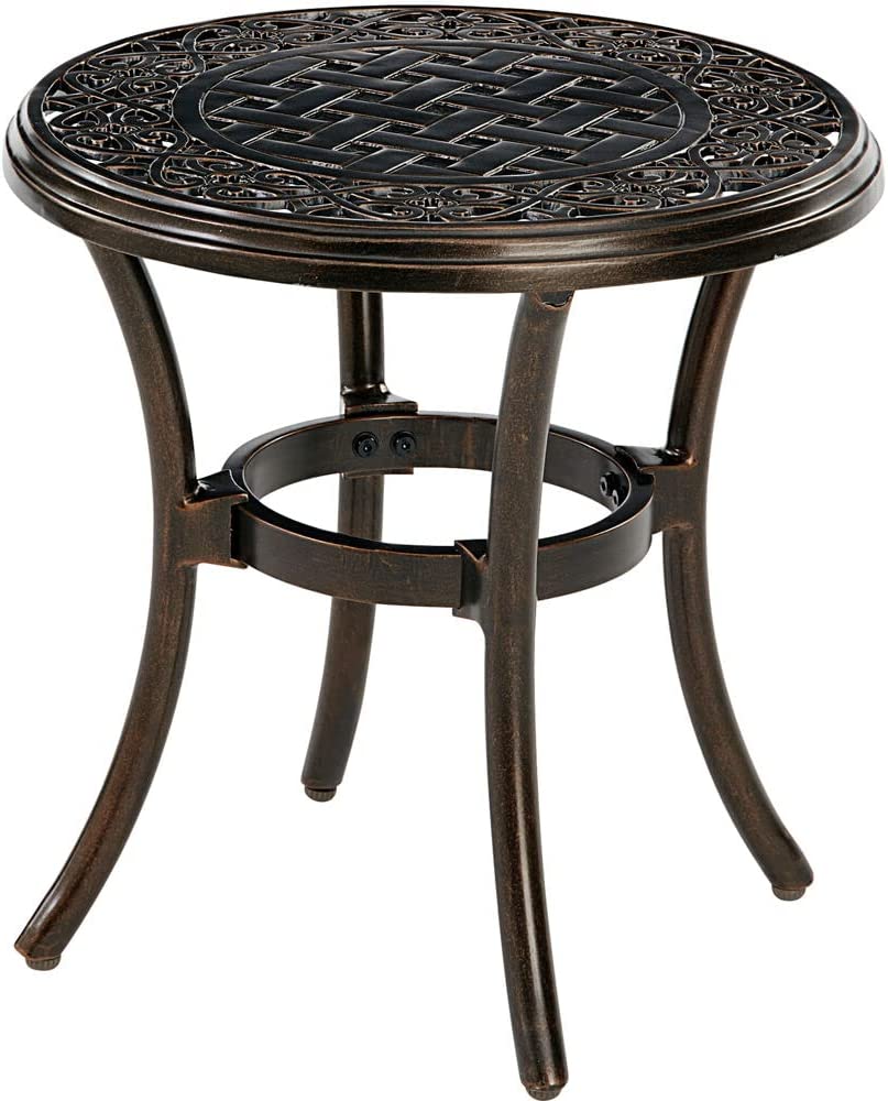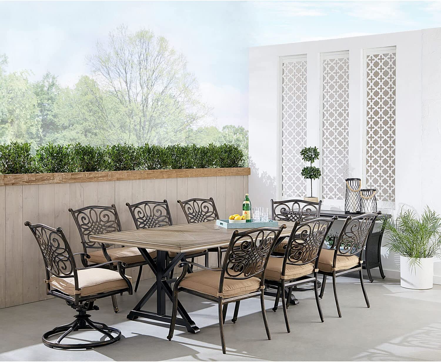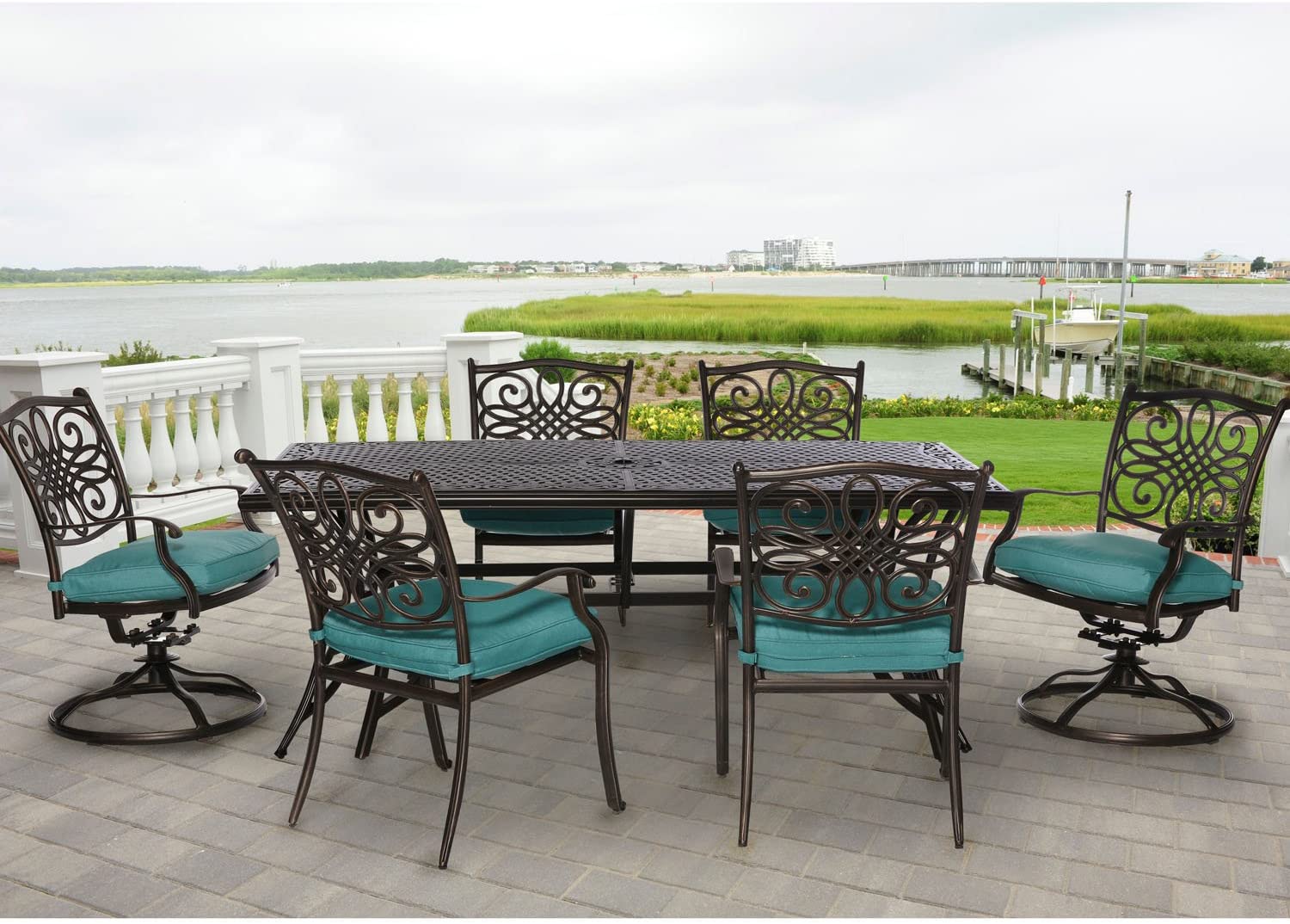 Hanover 7-Piece Tan with a 60 Cast-top Six Traditions Rust-Free Outdoor Patio Set Cushions, 6 Swivel Rockers and Aluminum Round Dining Table