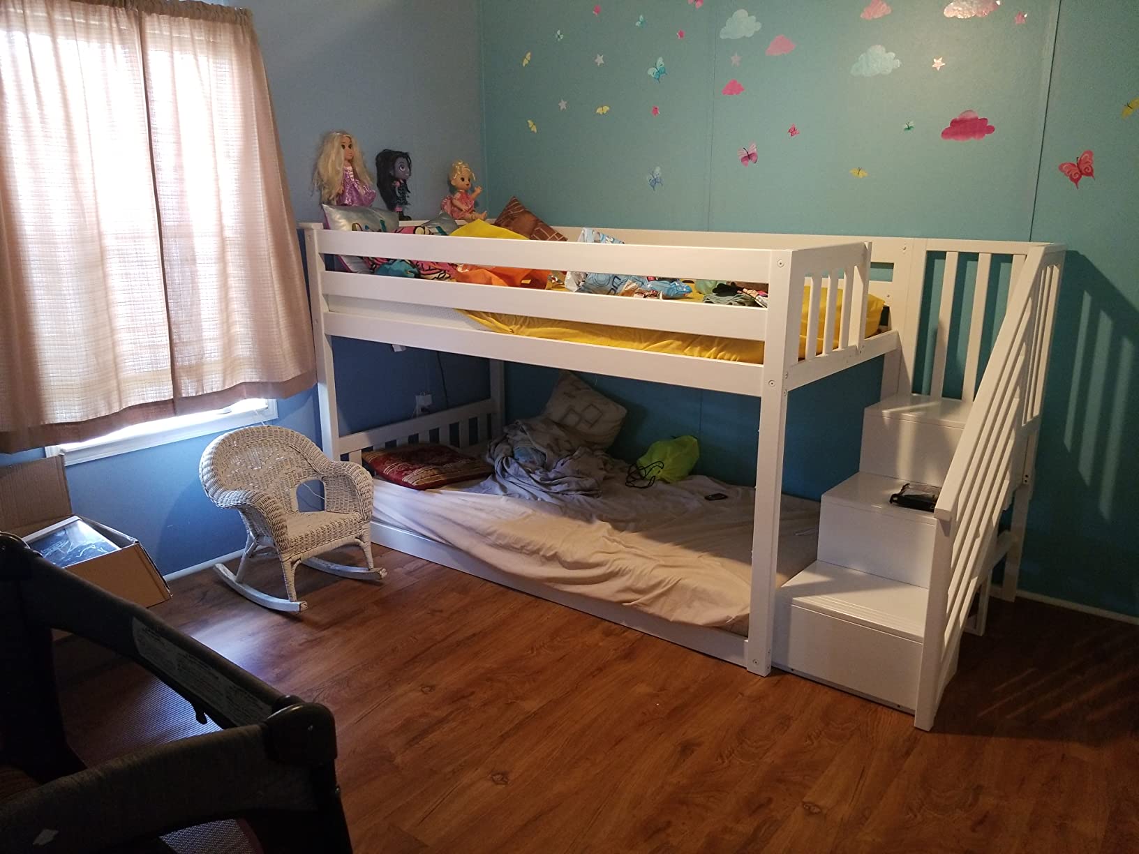 【Furniture】Double Full Bunk Bed Wooden Loft Bed, with Theater, Farmhouse, Ladder, Locker & Guardrail