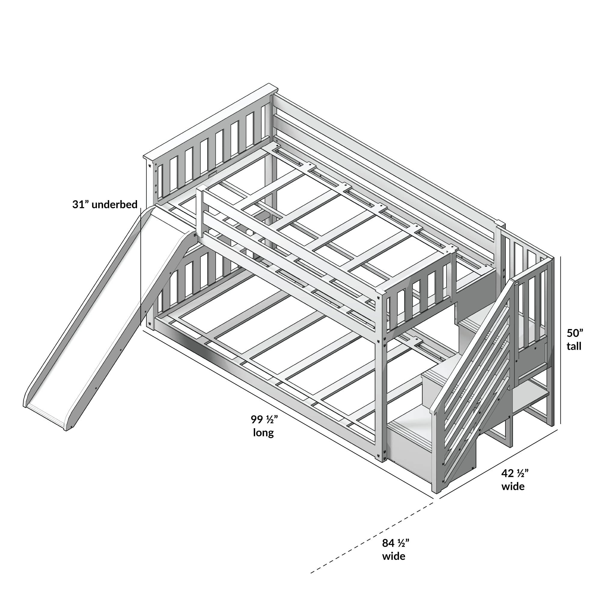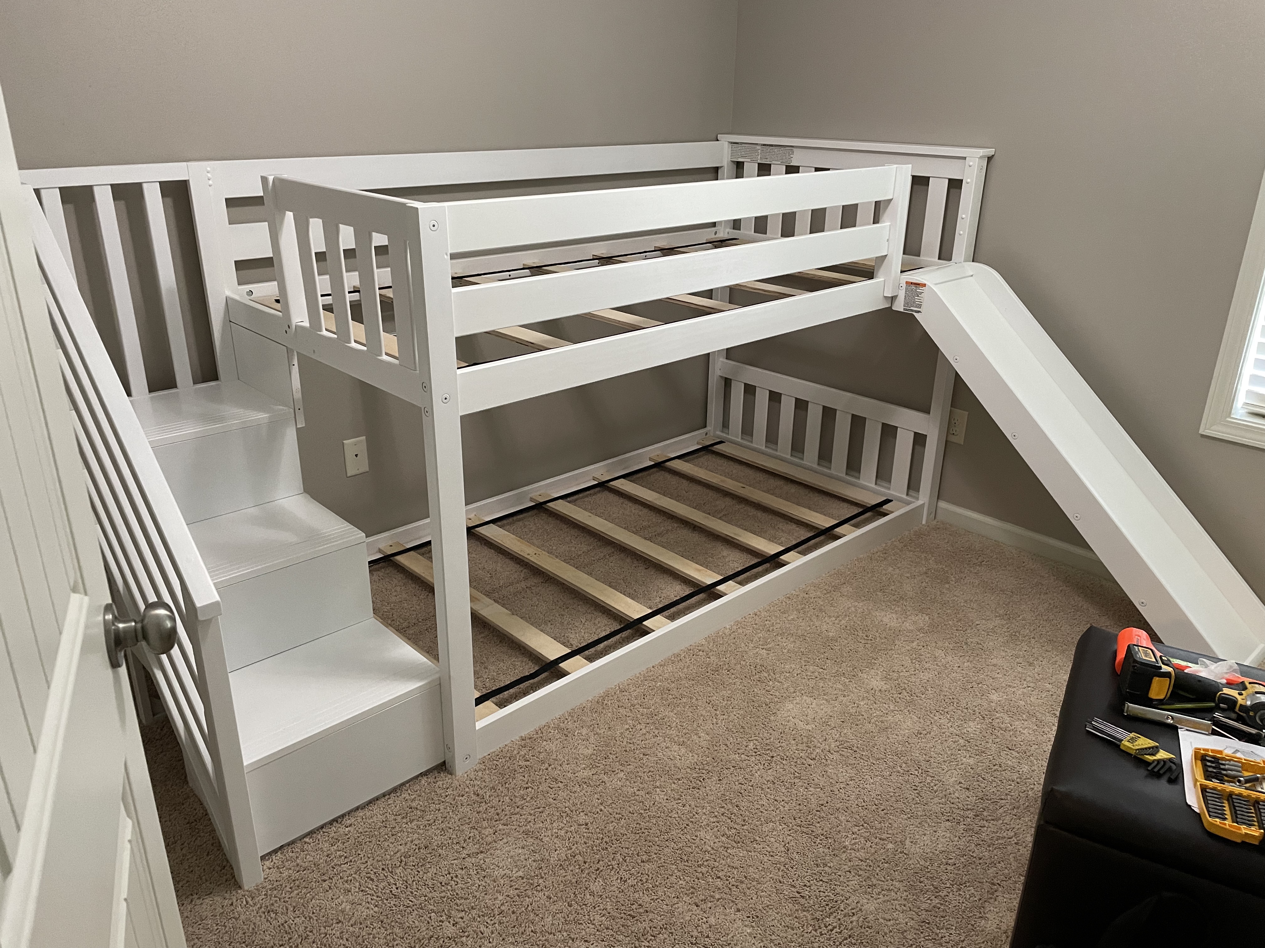 【Furniture】Princess Low Loft Stairway Bed with Slide Pink & White Tent & Tower, Loft Bed, Twin, White