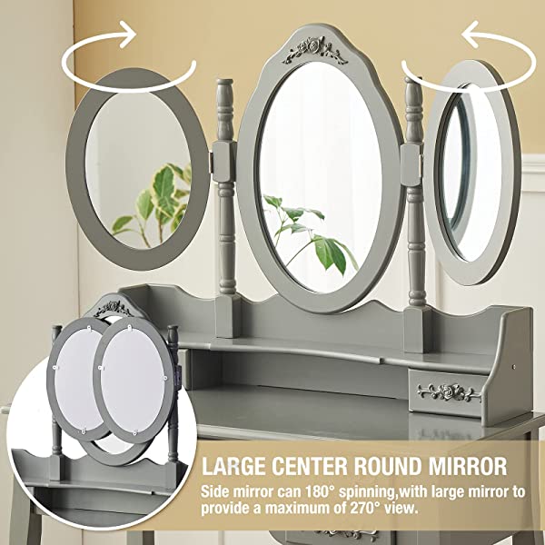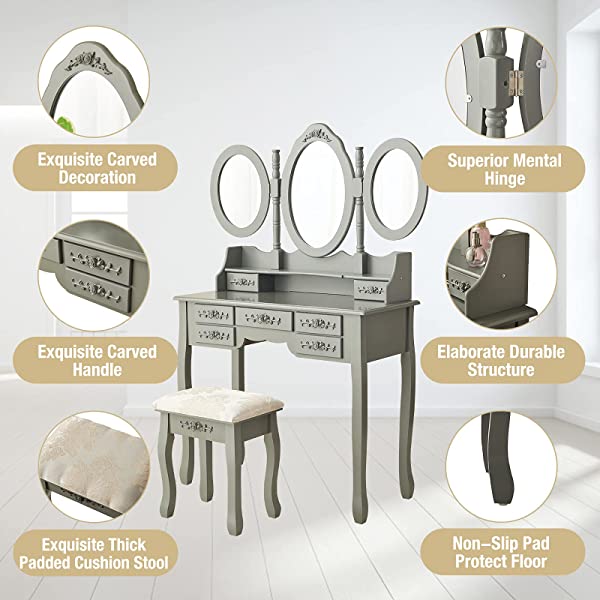 Vanity Table Set with Tri-Folding Mirror Makeup Dressing Table with Cushioned Stool & 7 Drawers and a Shelf, Makeup Dressing for Women, Girls, Bedroom (Grey)