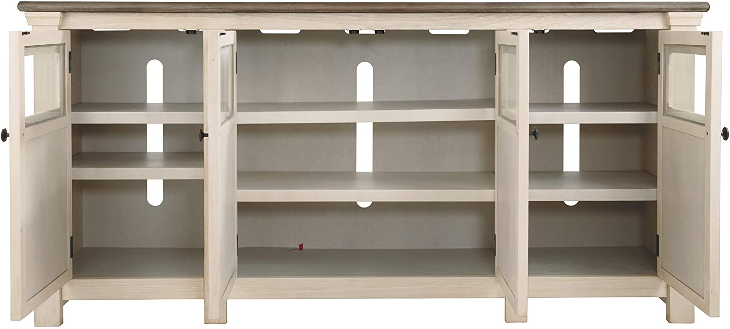 Signature Design by Ashley Bolanburg Two Tone Farmhouse TV Stand, Fits TVs up to 72", 3 Cabinets and Adjustable Storage Shelves, Whitewash