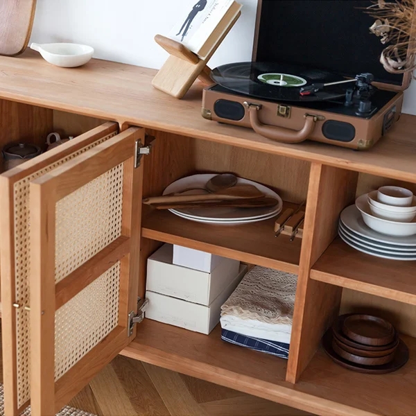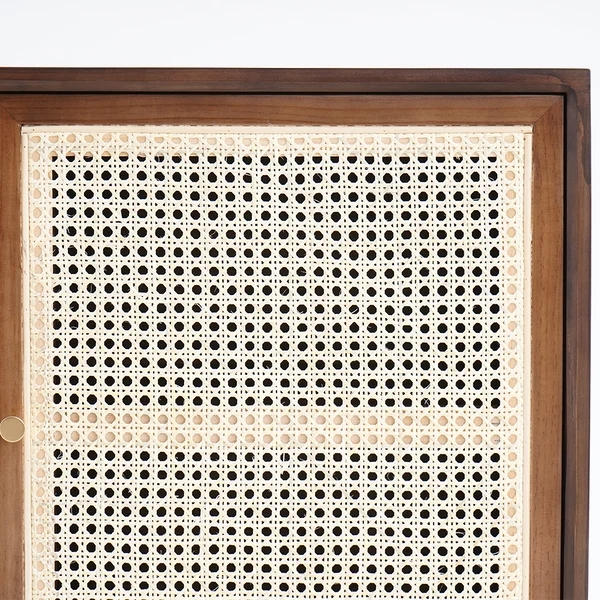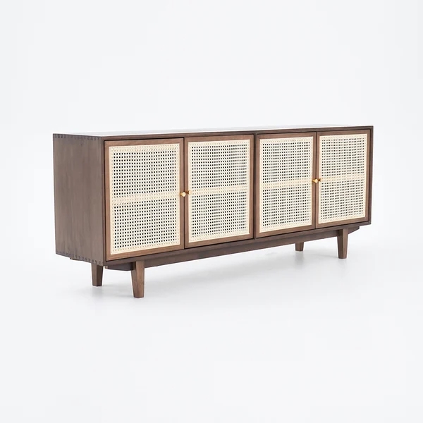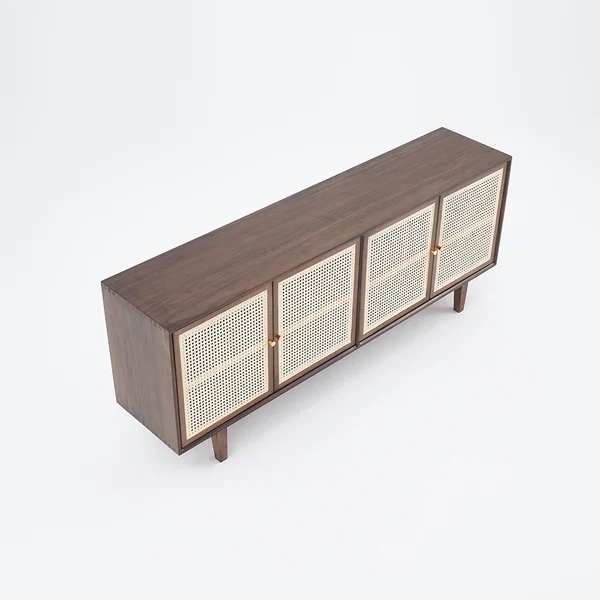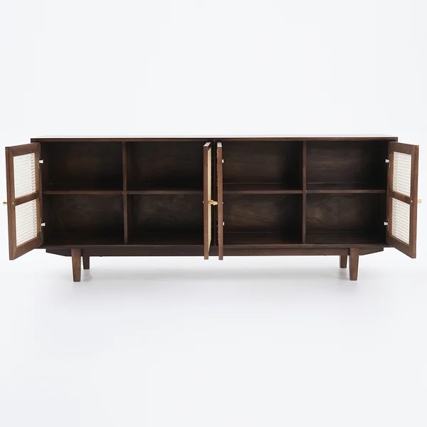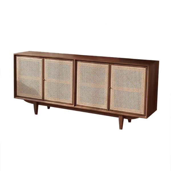 70" Nordic Walnut Sideboard Buffet Rattan Kitchen Cabinet with 4 Doors 4 Shelve in Large