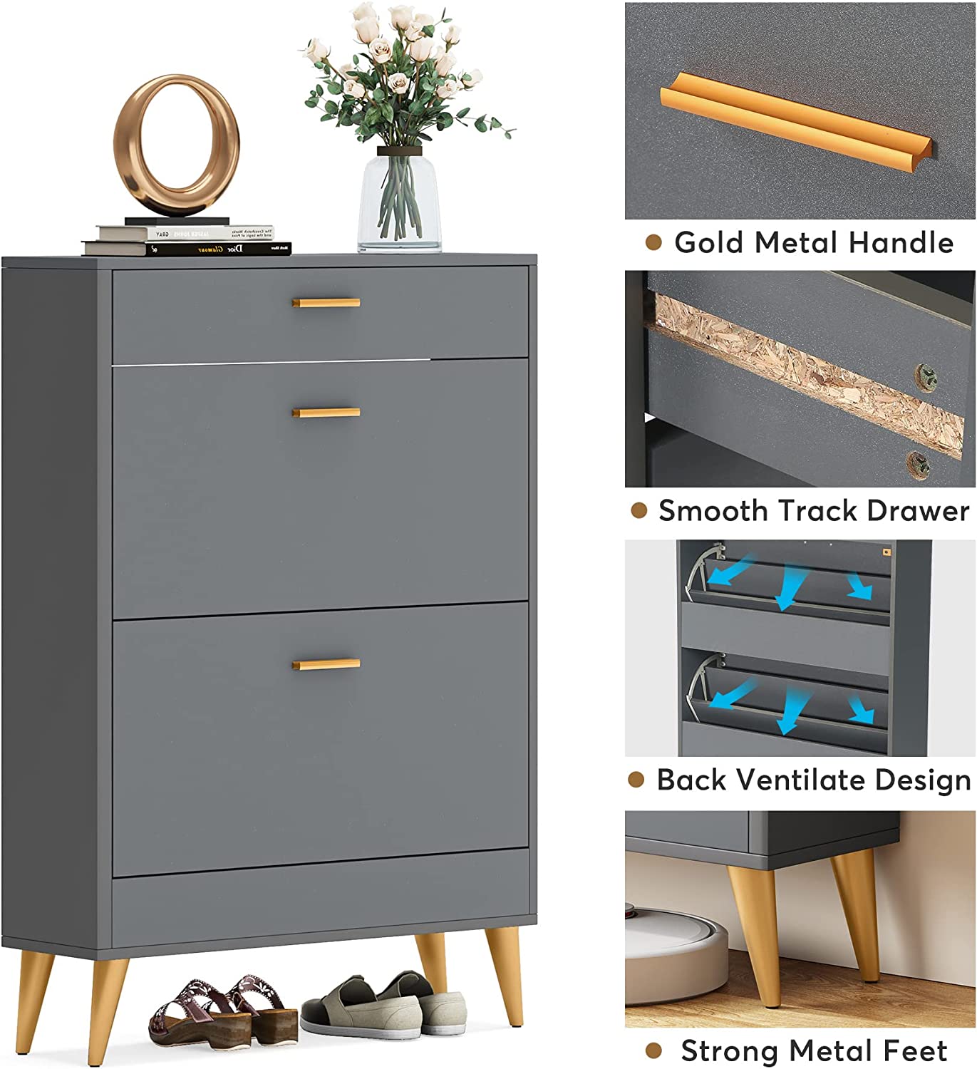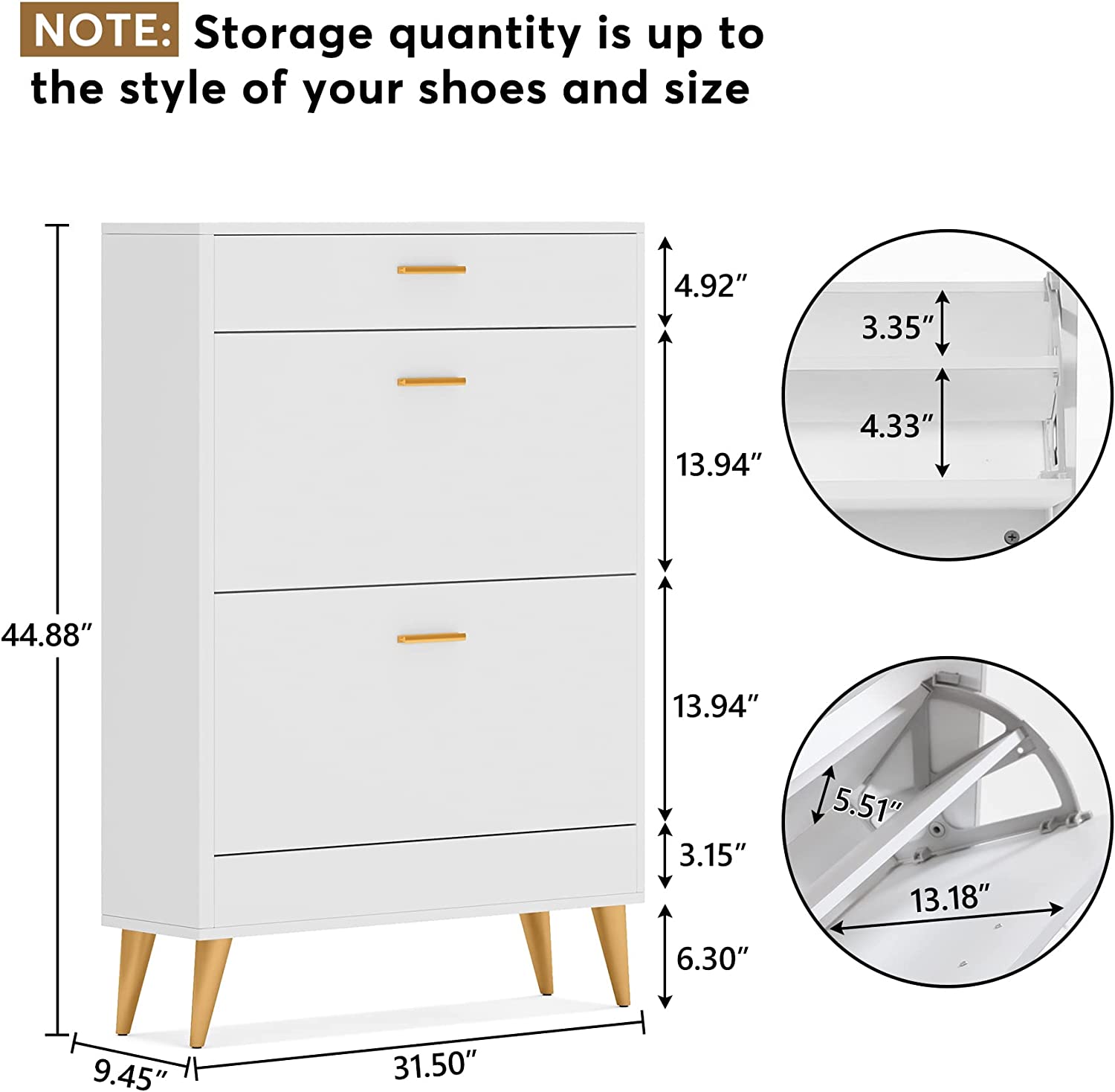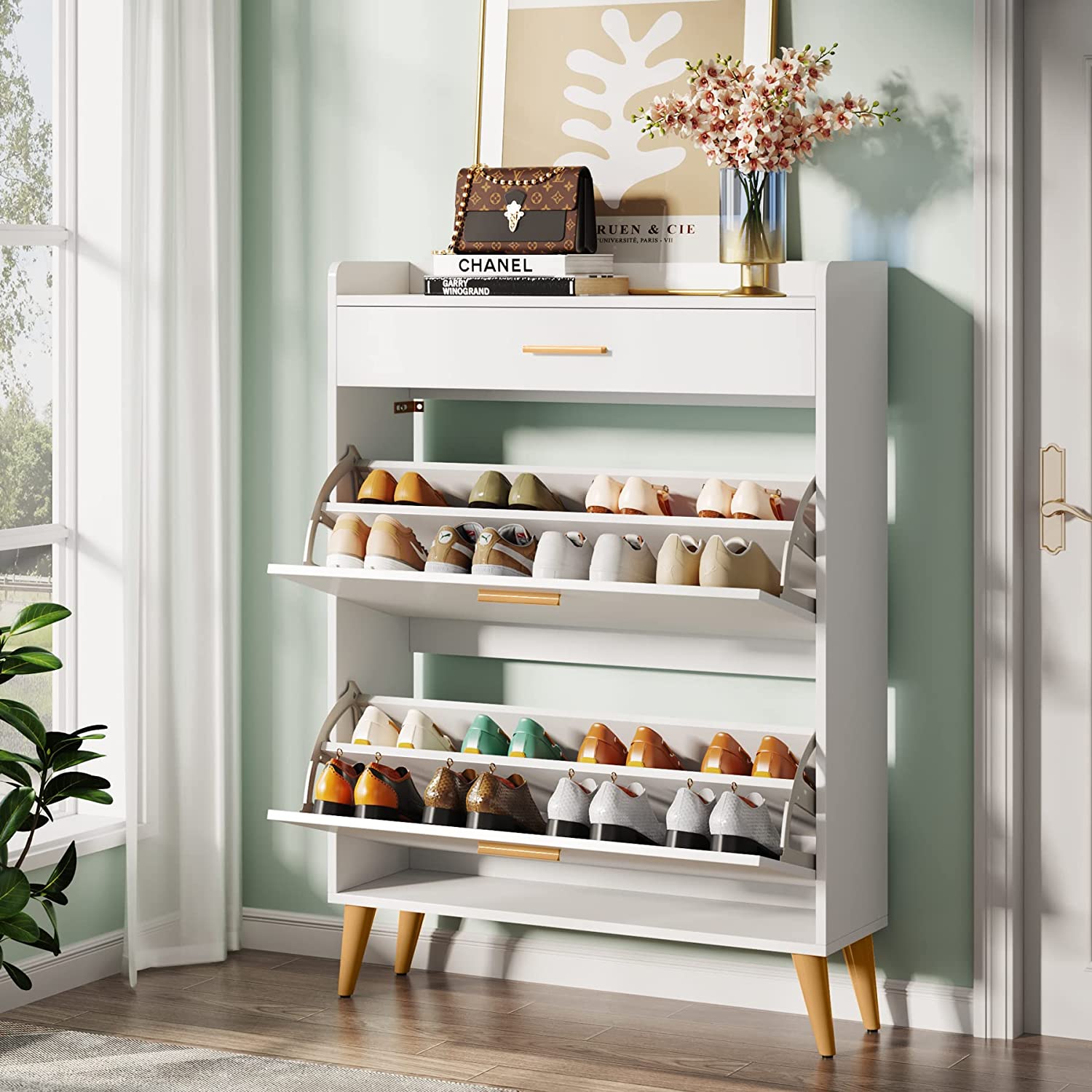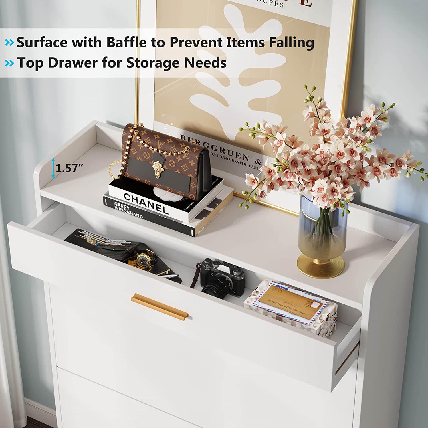 Tribesigns Shoe Cabinet, Entryway White Slim Shoe Storage Cabinet, Modern 16 Pair Thin Shoe Rack Organizer with 2 Flip Drawers (White + Gold)