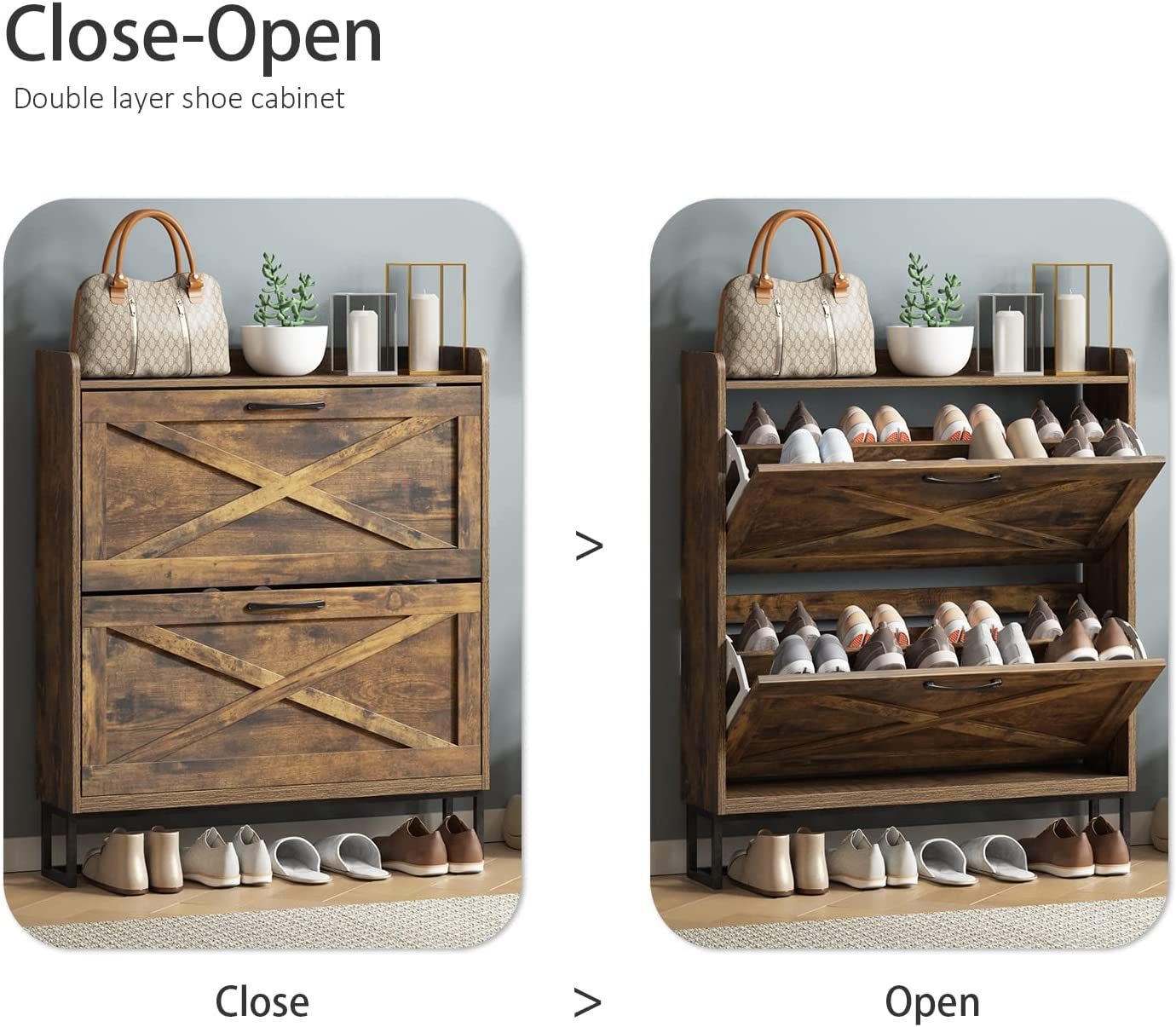 Maupvit Shoe Cabinet with 2 Flip Drawers, Freestanding Shoe Cabinet Organizer with Metal Legs, Shoes Storage Cabinet for Entryway, Narrow Shoe Rack Cabinet, Rustic Brown