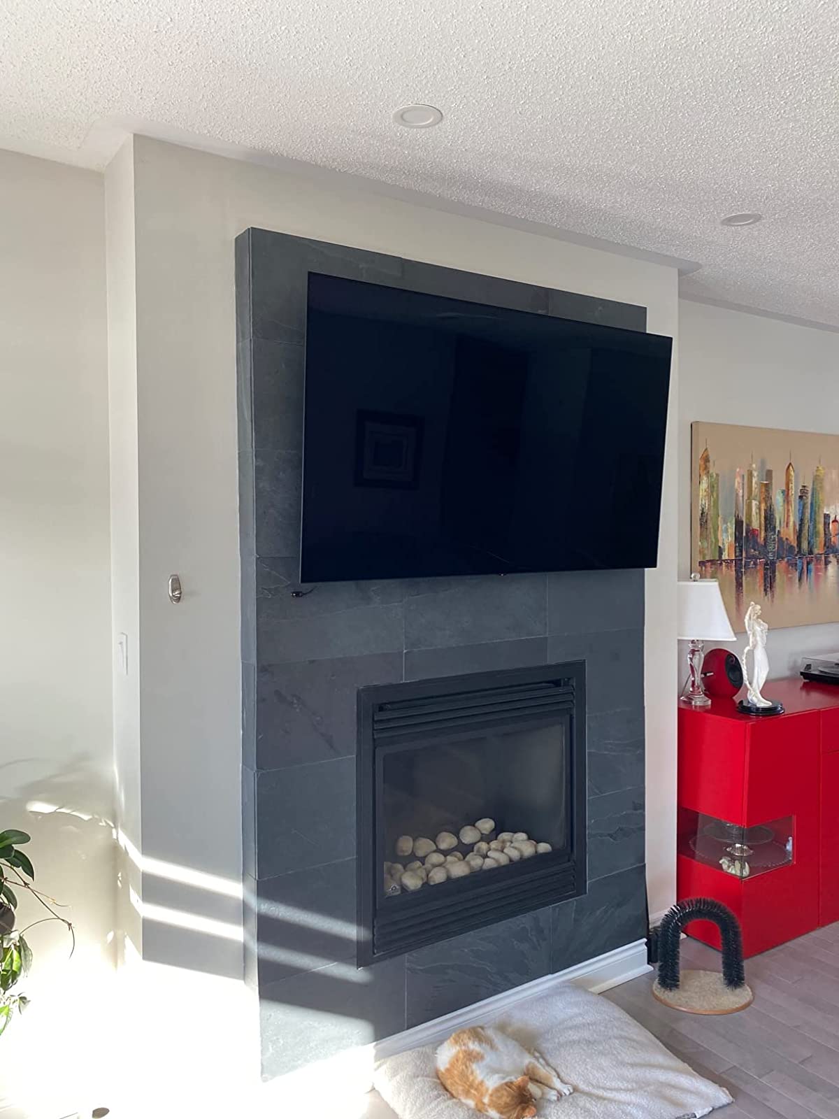 Answer:Although the tv itself isn’t very heavy, the stand that it attaches to is probably 30 of the 50+ pounds that the box indicates it weighs, and the TV attaches very securely with 4 screws. I cannot imagine that even the largest of cats could knock it over!Question:Can this be wall mounted? I don't see mounting holes on the back