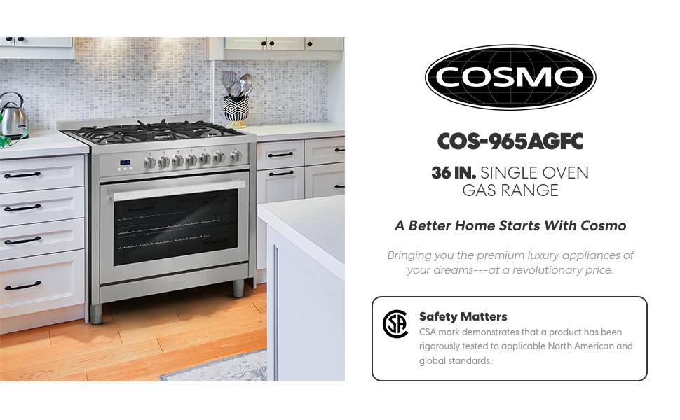 Bring professional quality home with Cosmo's COS-965AGFC 36 inch single oven gas range in stainless steel. Featuring 5 high-performance burners, you can create culinary masterpieces from start to finish. The cooktop is equipped with one 17, 400 BTU triple ring burner, one 8, 200 BTU rapid burner, two 6, 900 BTU semi-rapid burners, and one 5, 000 BTU auxiliary burner, giving you both precision and power for a wide variety of needs. A large 3. 8 cu. ft. oven provides ample space to cook for your whole family. Rapid convection technology delivers superior results by circulating air in the oven cavity to maintain even temperatures throughout- no more cold spots. A built-in display and electronic controls allow you to set the clock and timer for precision cooking.