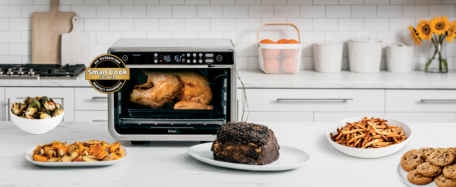 Meet the Ninja Foodi Smart XL Air Oven, the smart extra-large toaster oven and air fry oven with True Surround Convection, you get up to 10X the convection power of a traditional convection oven, so you can make quick family meals on 2 levels, no rotating required. Plus, the Smart Cook System monitors the internal doneness of your food so you’ll never under or over cook food again.