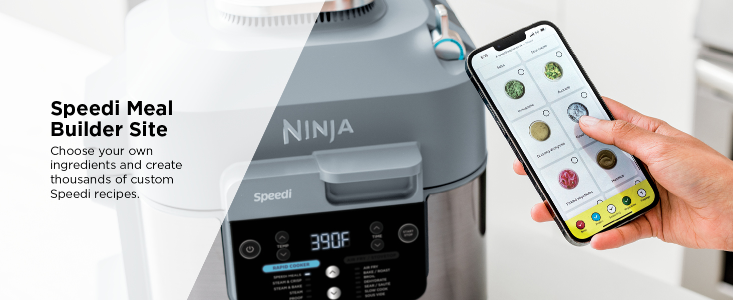 - THOUSANDS OF SPEEDI MEALS: Ninja’s Speedi Meal Builder unlocks thousands of customizable recipes with ingredients that are already in your fridge or pantry.