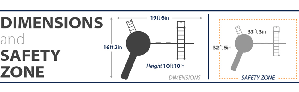 • Playset footprint – 15’ 3" W x 10’ 9" D x 8’ 10" H | Recommended safety zone – 33’ 3” L x 32’ 5” W | Swings & Slide Weight Capacity – 150 lbs. | Platform Weight Capacity – 600 lbs. | For children between 3-12 years