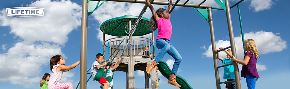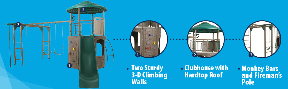 • Your purchase includes One Lifetime Adventure Tower Deluxe Playset in Green color | 9’ Wavy Slide, Monkey Bars, 1 Trapeze Bar, 2 swings, 2 climbing walls and Clubhouse with Hardtop Roof and 4 Storefronts
