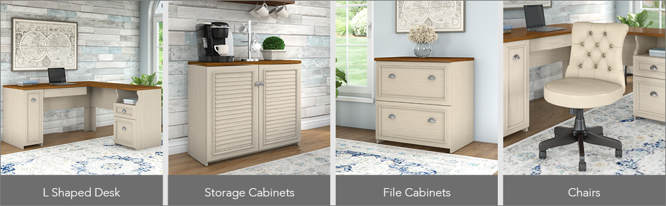 Brand Bush Furniture Shape L-Shape Product Dimensions 59.53"D x 60.28"W x 68.95"H Color Antique White Style Vintage Special Feature Adjustable Room Type Office Mounting Type Found in image, Freestanding Item Weight 429 Pounds Furniture Finish Antique white Size 60W Included Components L Desk, Hutch, Lateral File and 5 Shelf Bookcase Assembly Required Yes Model Name Fairview Item Weight 429 pounds Manufacturer Bush Industries