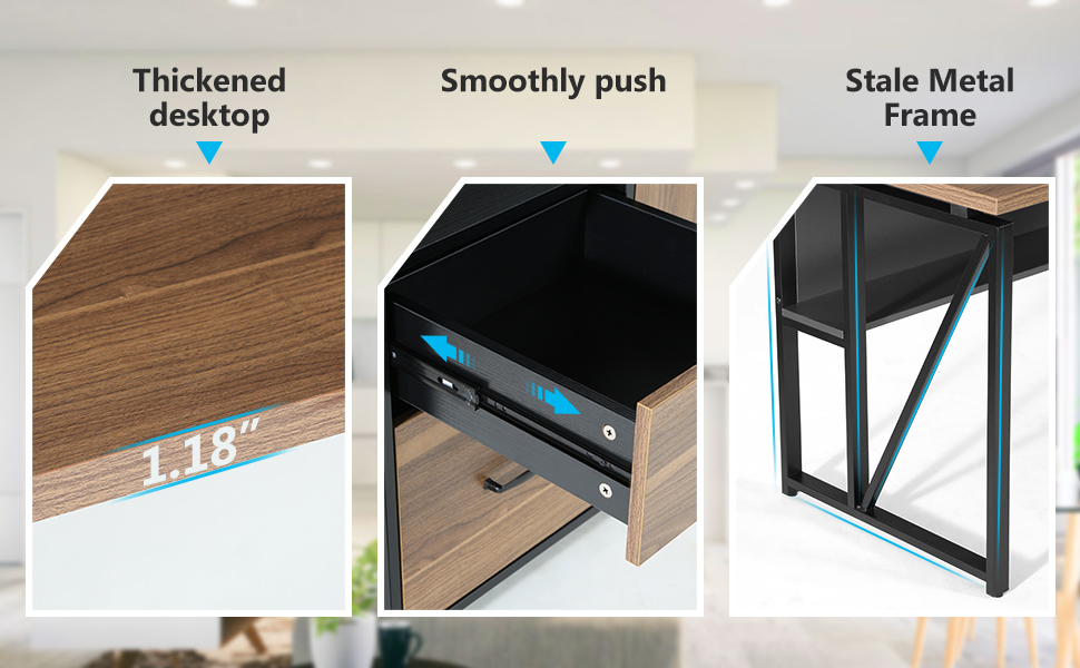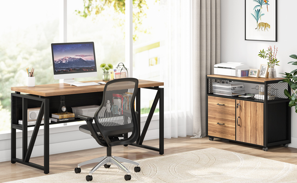 - 【Sturdy & Beautiful finish】:The office desk constructed of heavy-duty metal frame and thickened compressed board (1.2 inch) ensure durability and stability. The furniture set is a combination of vintage colors and black match any decor style.