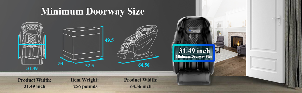 Or you can unpack the massage chair and move in your home.The massage chair width is 31.49 inches.So the door dimension should at least 32 inches.