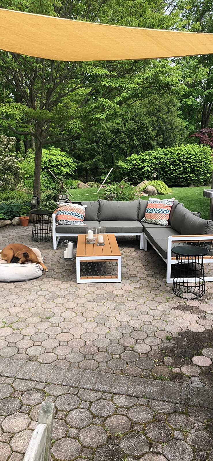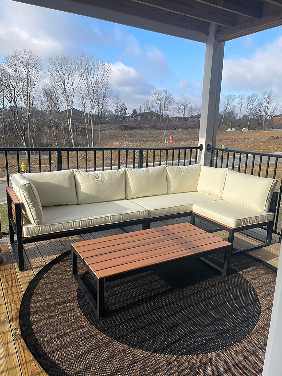 You will not be disappointed with your purchase of this item. For the price it's hard to find this level of quality and style. Our outdoor patio has never looked so good or been this comfortable. Materials: The aluminum frame comes finished in a bright white. It's light and looks fantastic. The powder coating was done well. The wood is treated for outdoor use, looks flawless and is not cheap and thin. The cushions are also treated to repel water. This is a well-made piece. Style: As you can see from the photo it accents our patio perfectly. The neutral grey cushions open up options for colorful throw pillows. The white pops against the natural wood and grey and background while the roping on the ends adds appealing flair. The whole piece matches beautifully with the decking. Comfort: The cushions are full and firm offering ample support for women and men of all sizes. When lying down you could easy doze off. The large sturdy table makes for a great ottoman. Setup: The light aluminum frame makes build a snap. The connection points are pre-drilled and mostly accurate. We put this together in about 30 minutes using the provided bolts and allen key. There were no issues along the way. Overall: We love it. We have a 9x13 patio and after weeks of searching settled on this. We picked the right piece and now it's too hot to sit outside lol I would recommend this piece to anyone looking to entertain guests or just work outside.