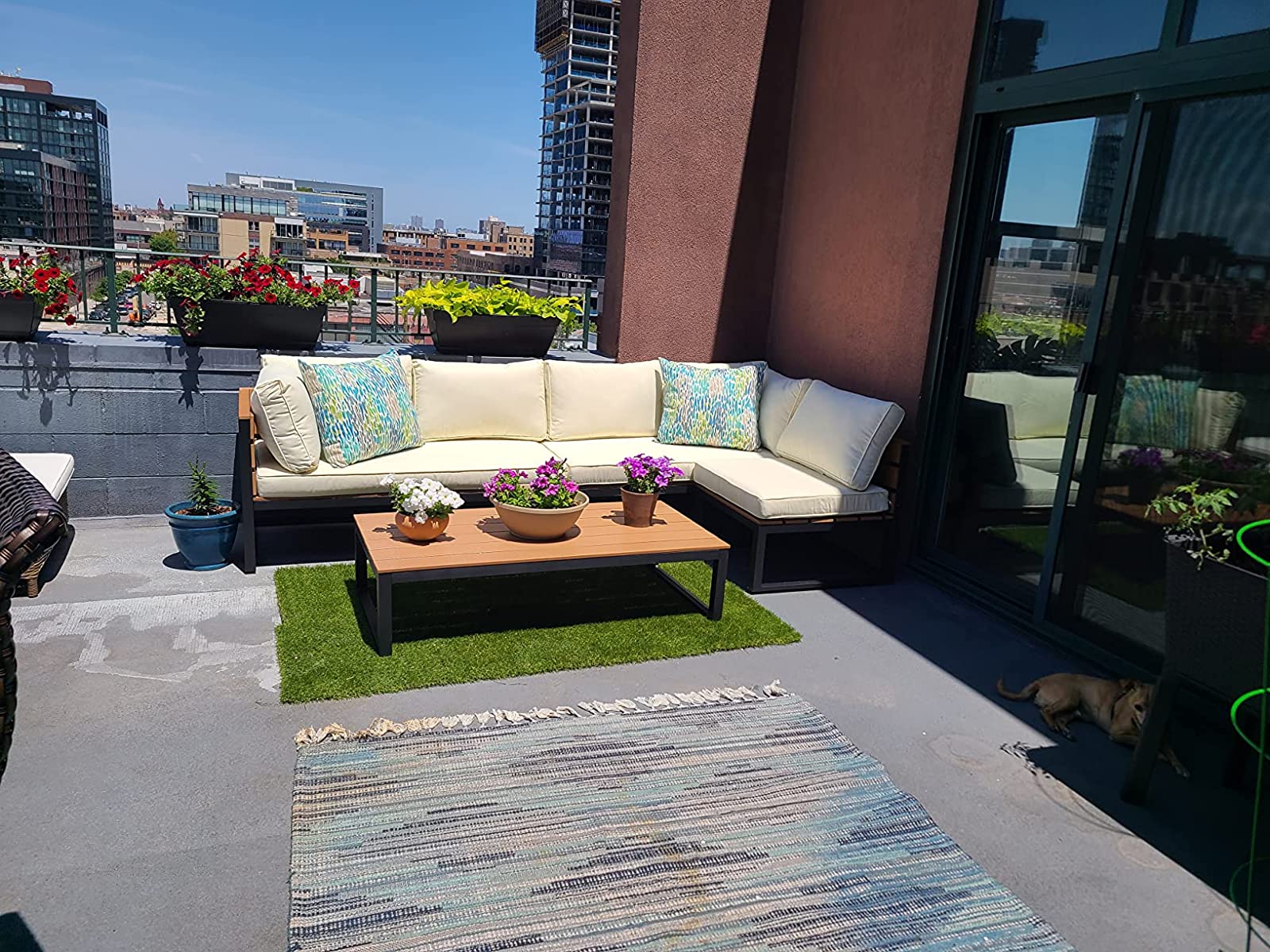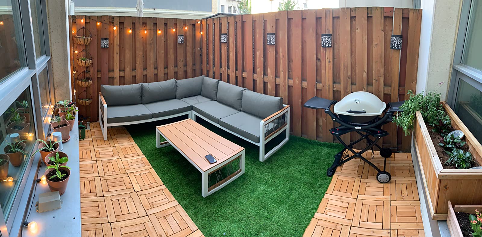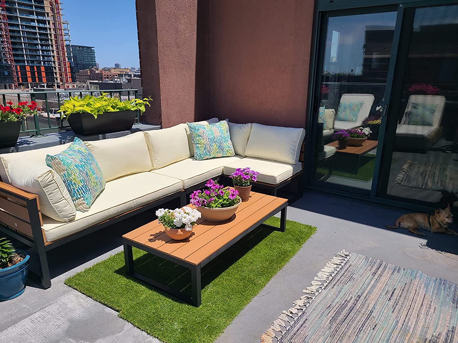 This is better than expected!! I was worried about quality, but the cushions are stuffy and packed. Very full. The quality of furniture is pretty good. It fits on the terrace of my 2 story penthouse nicely. I added the accent pillows and it really popped! I like that this configurable. I can always re-arrange into an L shape as well. The Amazon delivery brought straight up the elevator to my place. Great delivery too!! Just as scheduled and on time. No complaints. You should buy this today. The assembly was actually easy. I had it unboxed and assembled by myself in 1-2 hrs. Wow!!