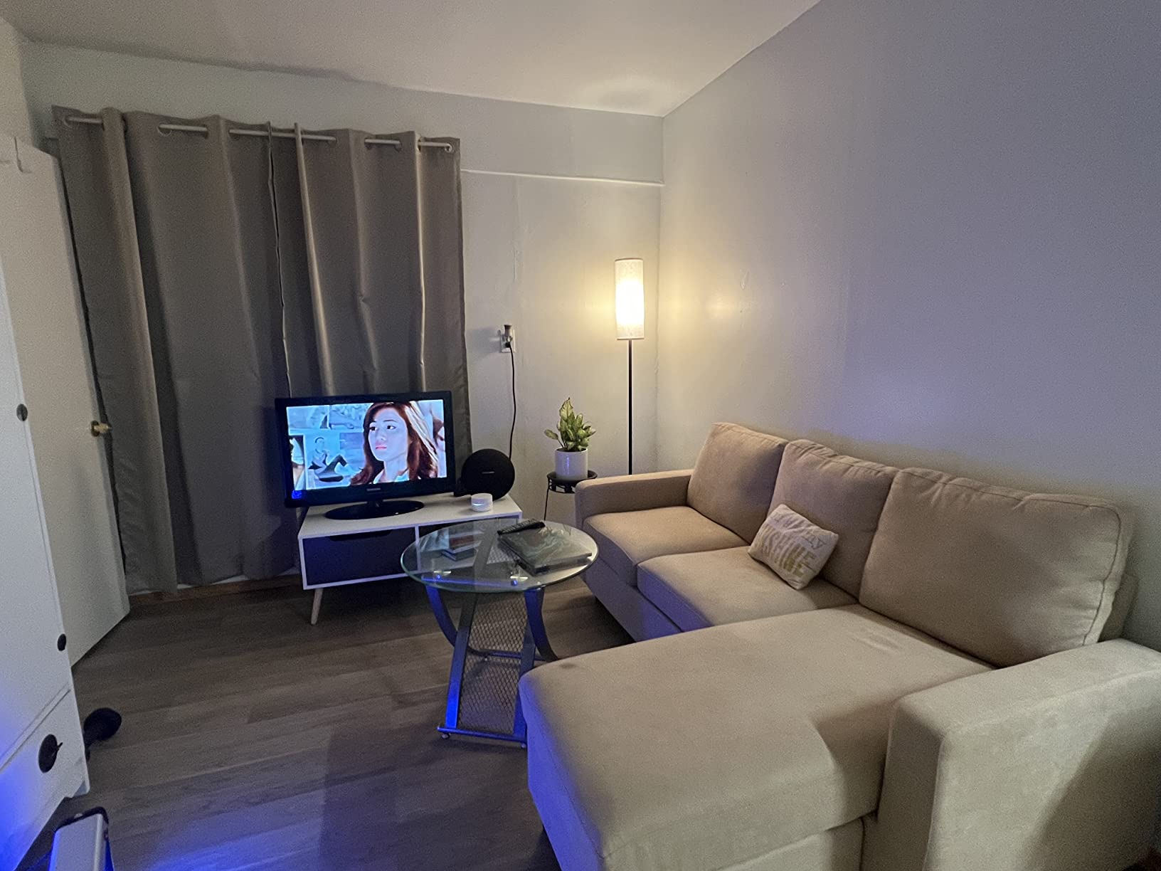 If you want a decent couch for your apartment that’s cheap and will get there fast, this does the trick. It took like 20 minutes to put together. It’s not huge but it’s good for my partner and I.The couch does come apart so you can wash and clean it but I wouldn’t recommend it. The velcro folds in on itself and it gets all wrapped up. Likewise, it just gets all messed up and it ripped the fibers out. Now it’s all textured and fuzzy.